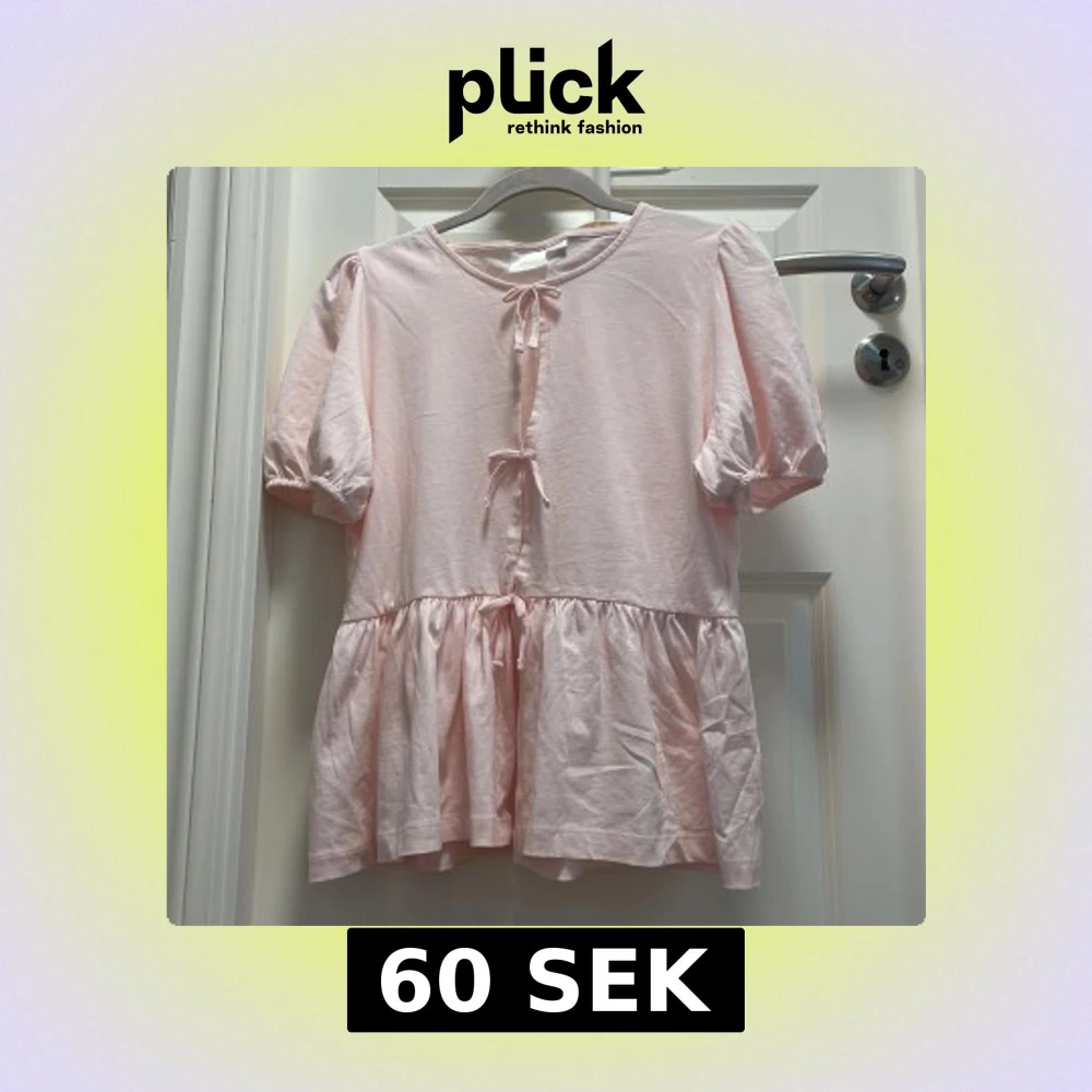 Supersöt ljusrosa blus från Gina Tricot med puffiga korta ärmar och tre knyt framtill. Blusen har volang nedtill och är gjord i mjuk bomull. Använd 1 gång❤️storlek 170