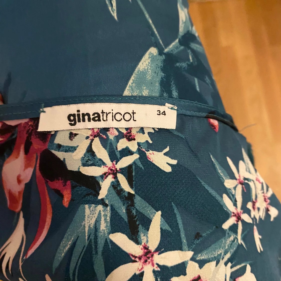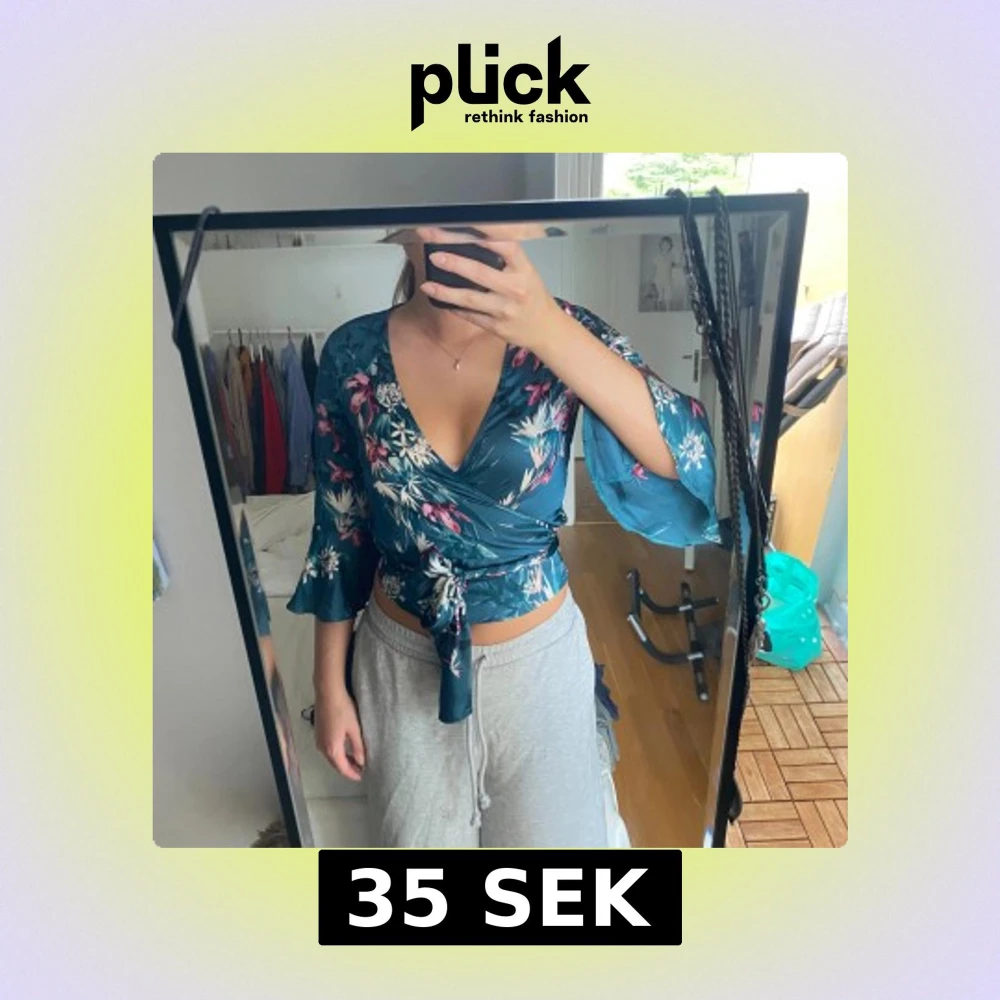 Supersnygg blommig omlottopp från Gina Tricot i blått med vita och rosa blommor. Croppad modell med knyt i midjan och vida trekvartsärmar. Perfekt för dig som vill ha en trendig och färgglad look!