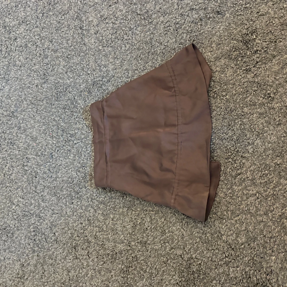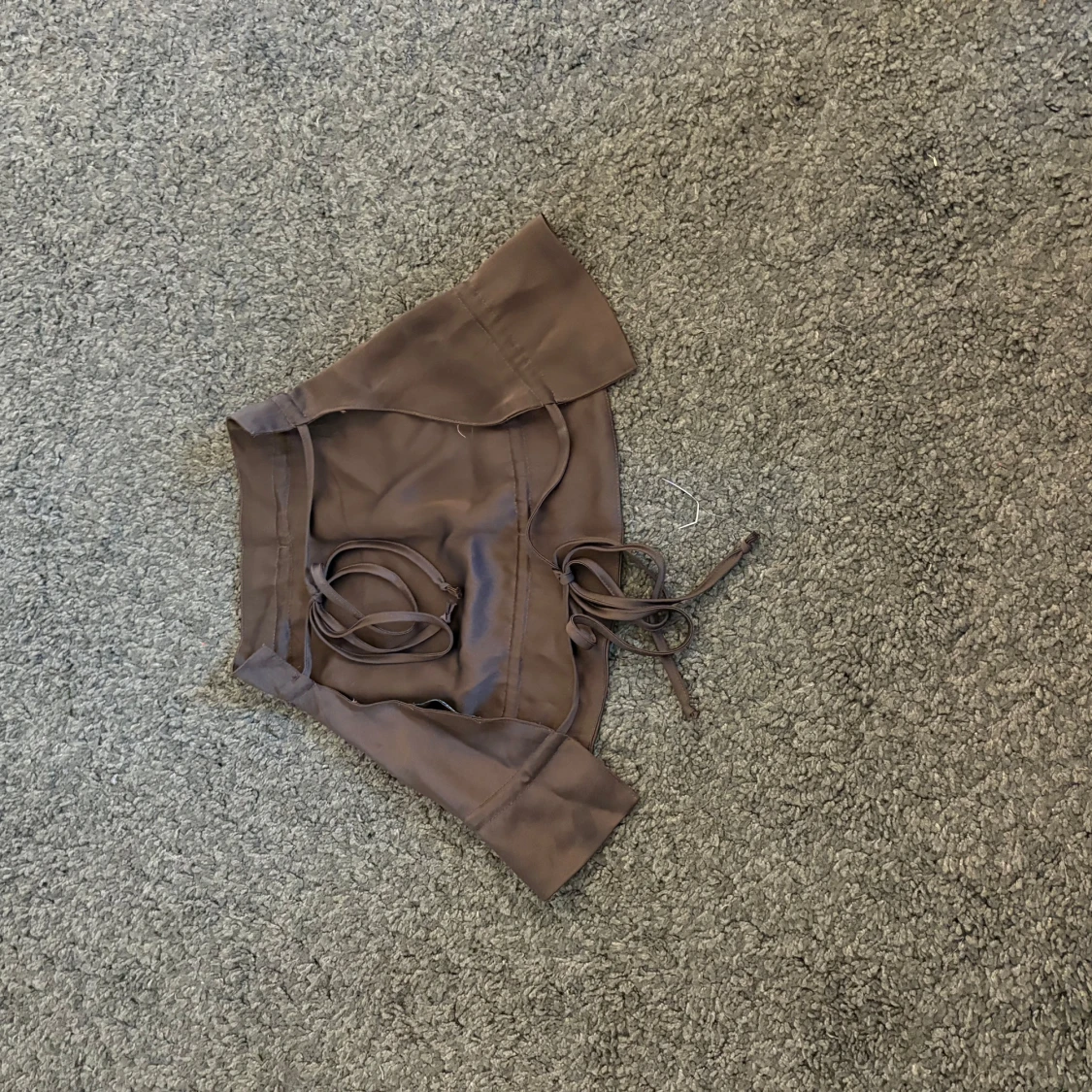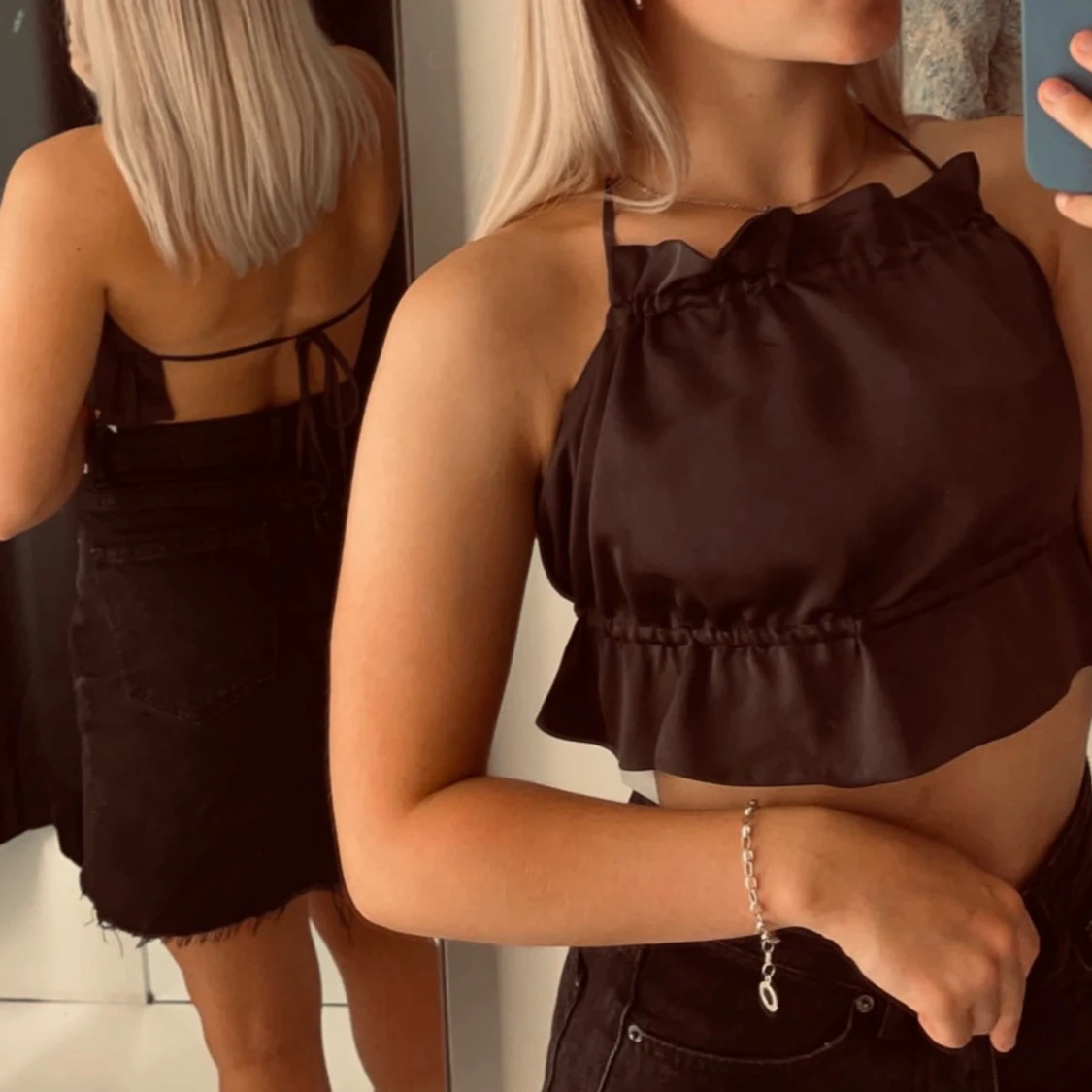 Säljer en brun croppad linnetopp med volangkant nertill och tunna axelband. Toppen har öppen rygg med snygg snörning som knyts baktill. Materialet är glansigt och känns mjukt mot huden, perfekt för varma dagar.