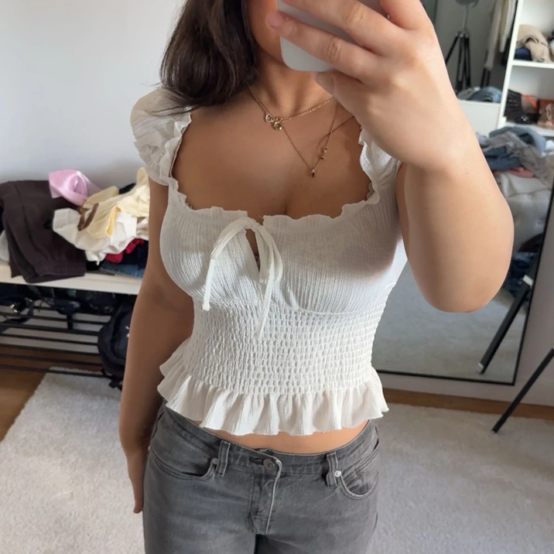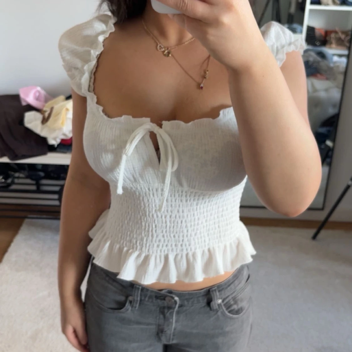 Säljer en söt vit croppad blus med volangkant och knyt framtill. Toppen har korta puffärmar och smockad midja som ger en fin passform. Perfekt till sommaren och passar till både jeans och kjol. Helt oanvänd! Pris kan diskuteras 💓