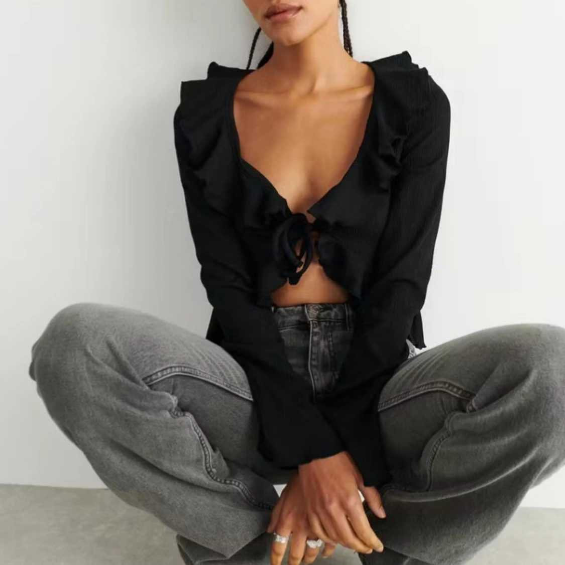 Trendig svart croppad blus med långa ärmar, djup v-ringning och volangdetaljer längs halsringningen. Toppen har knyt framtill som ger en snygg och feminin look. Perfekt att styla med jeans eller kjol för en cool outfit.