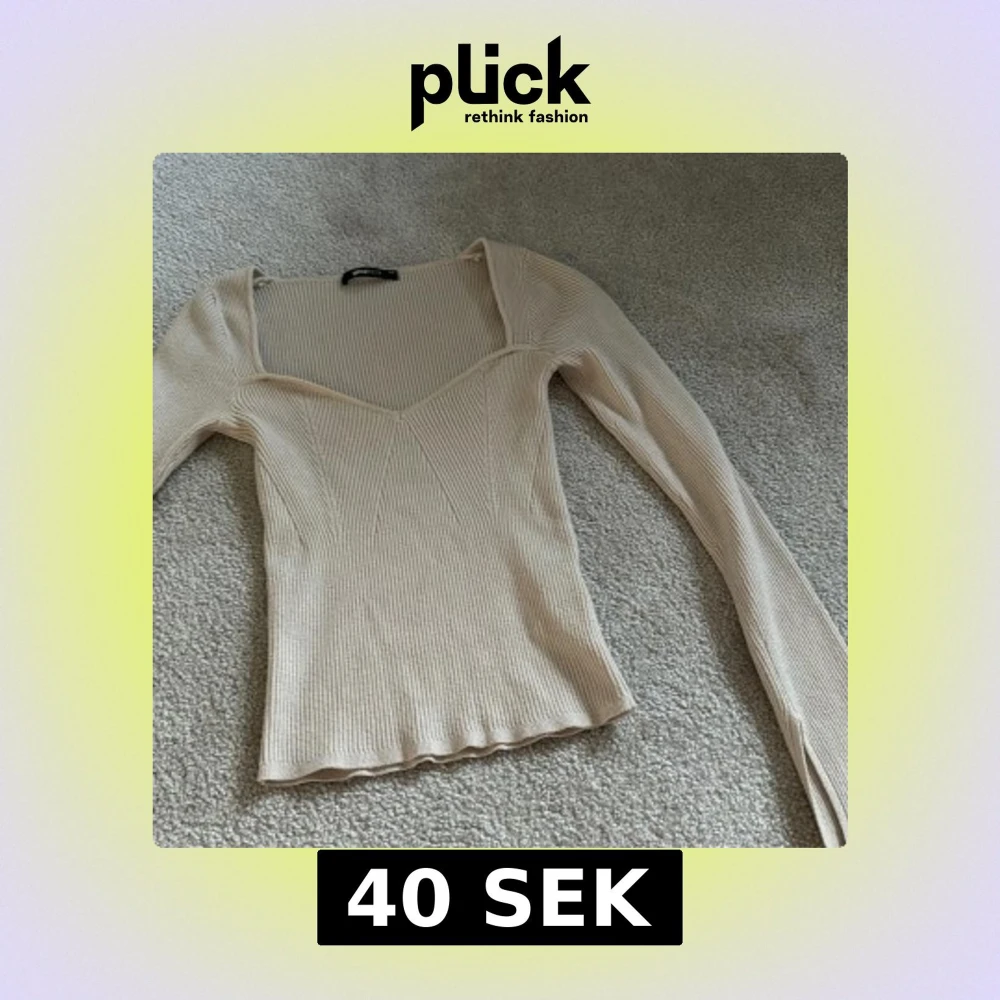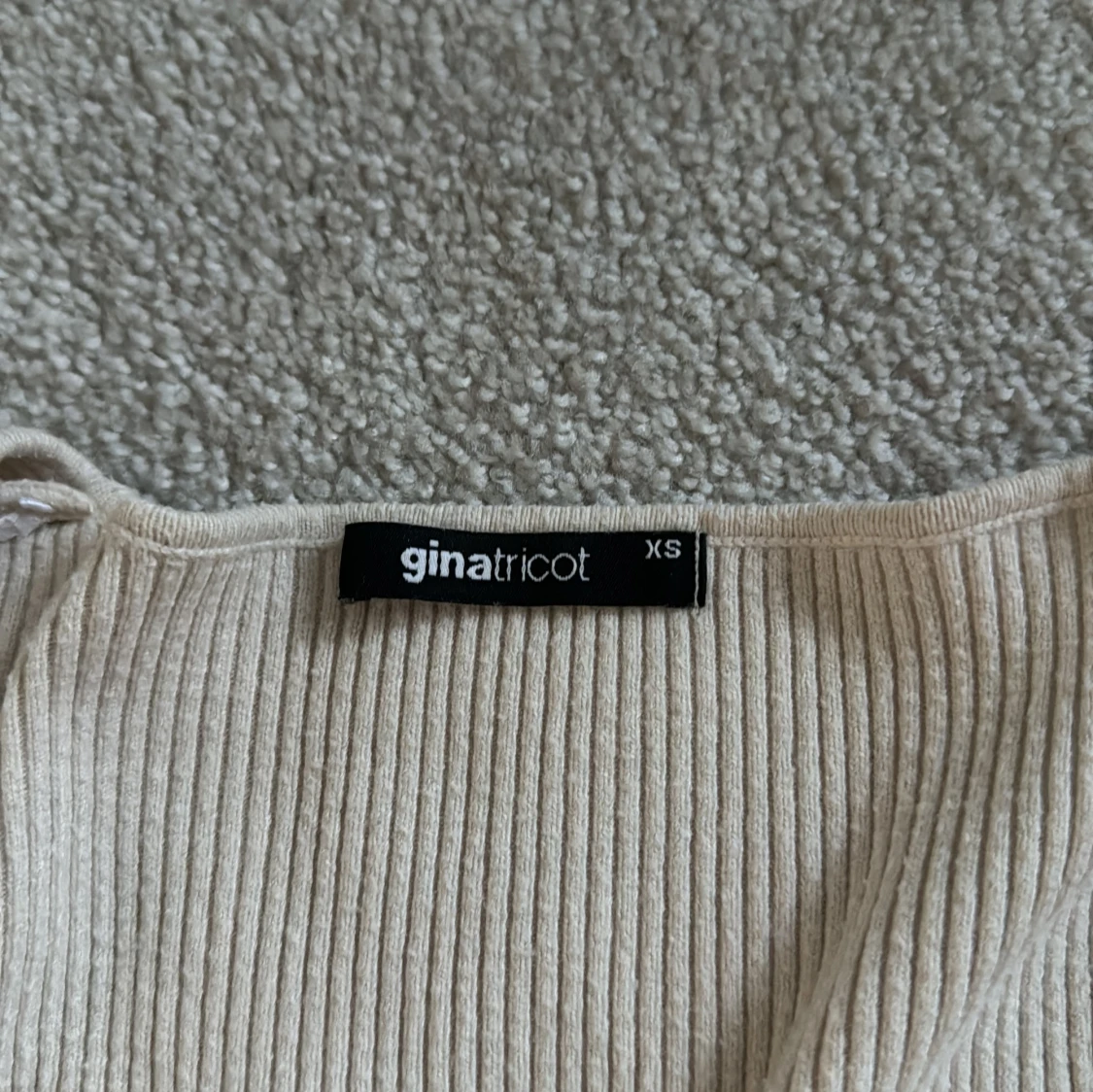 Säljer en beige ribbad topp från Gina Tricot i storlek XS. Toppen har lång ärm, v-ringad halsringning och figurnära passform. Perfekt att styla till olika outfits!