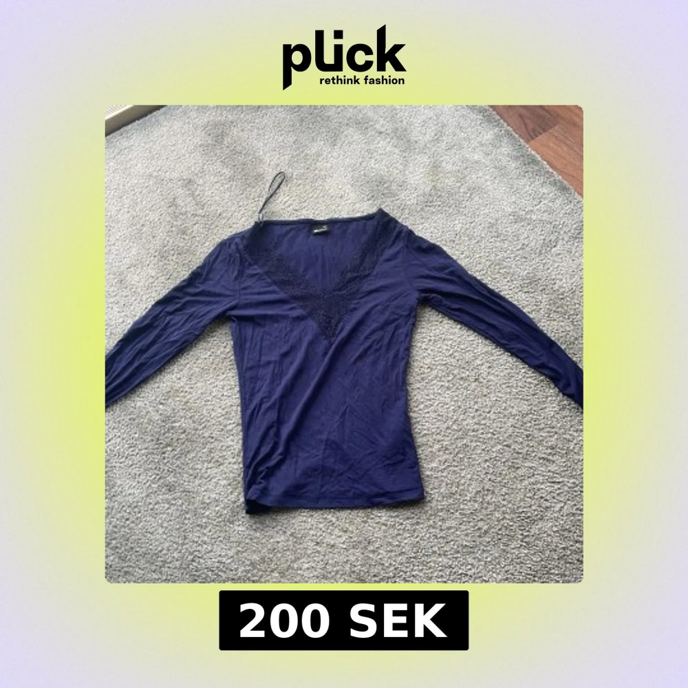 Säljer en mörkblå långärmad topp från Gina Tricot med v-ringning och spetsdetaljer. Perfekt för en stilren look. 💙