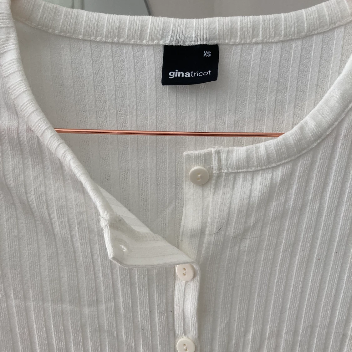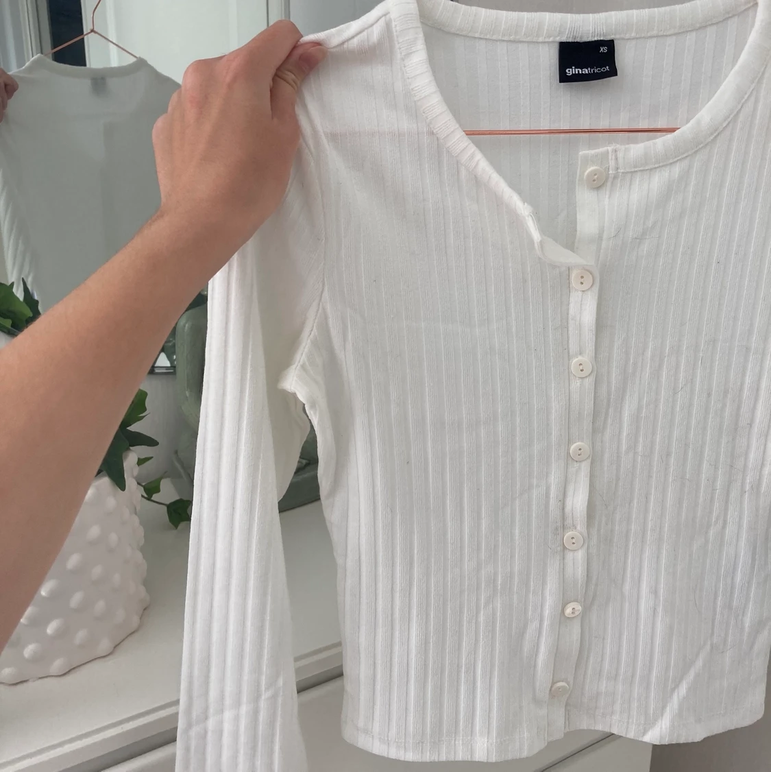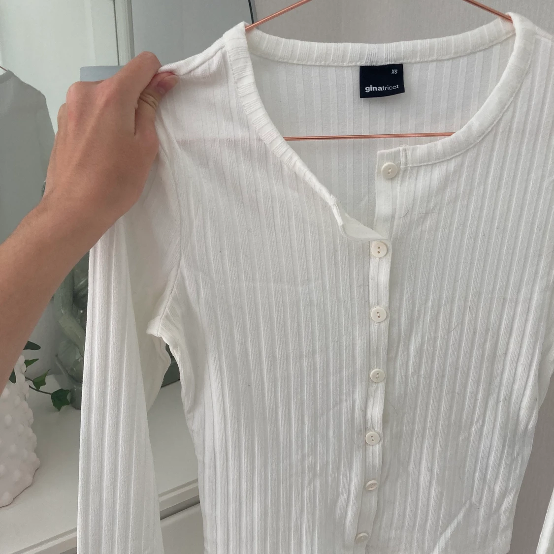 Säljer denna vita ribbade topp med knappar, kan användas som kofta över en topp också, den är i nyskick och aldrig använd, storlek XS men sitter lite tight💕