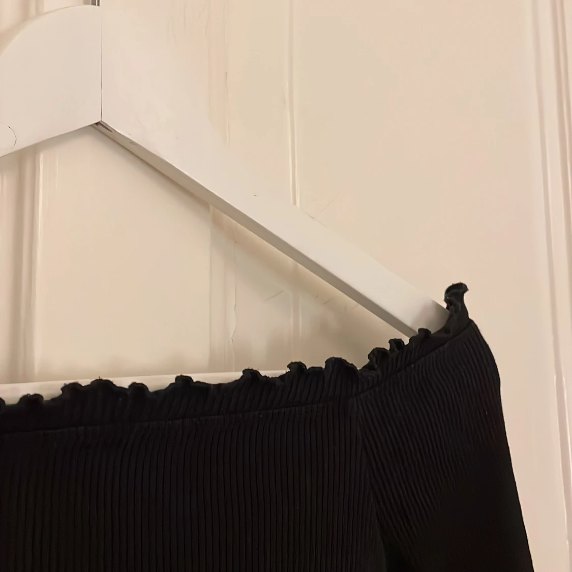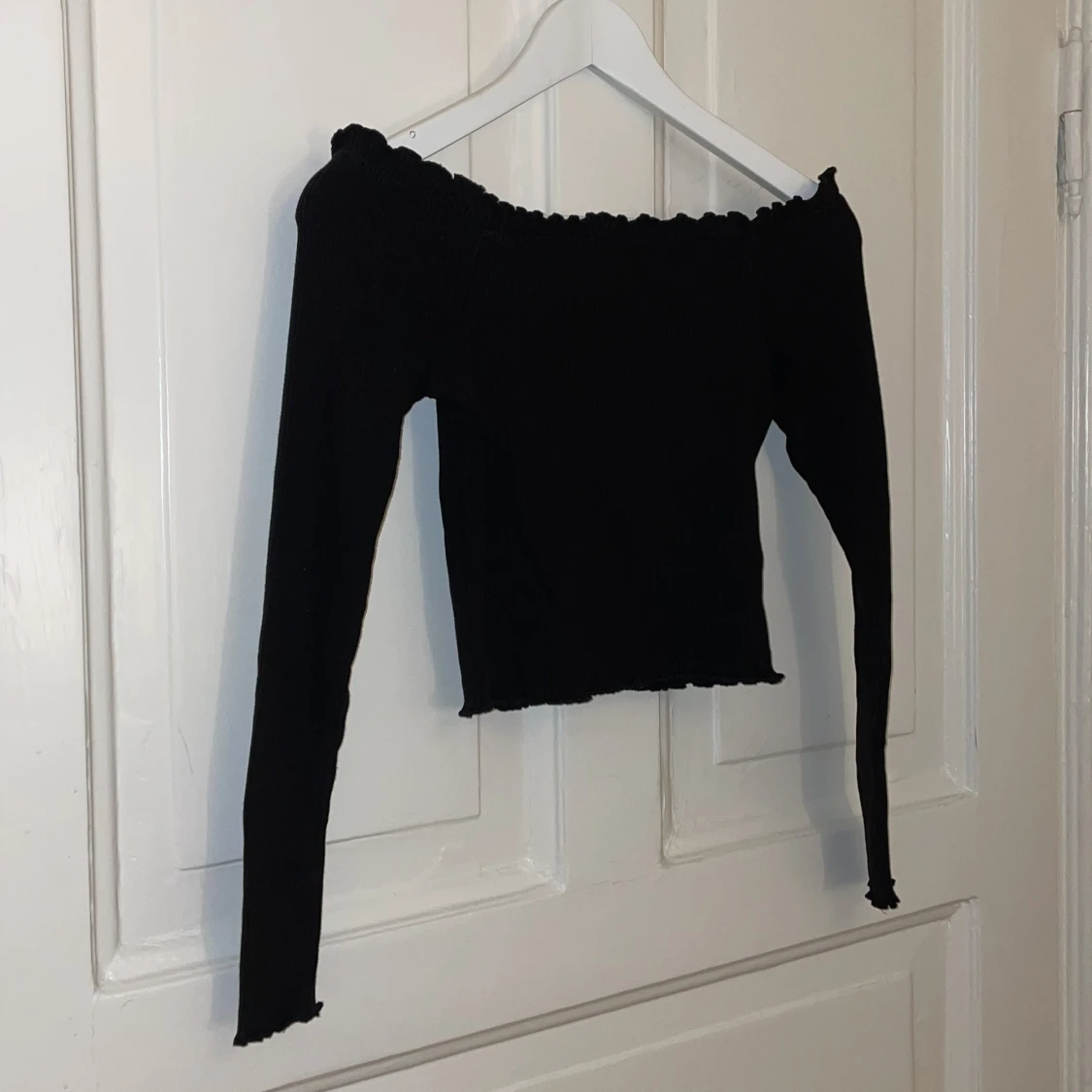Svart off shoulder tröja från Gina Tricot. Den är tight i modellen och ganska kort. På alla ändar av tröjan finns det små voulanger 🫶🏼💫