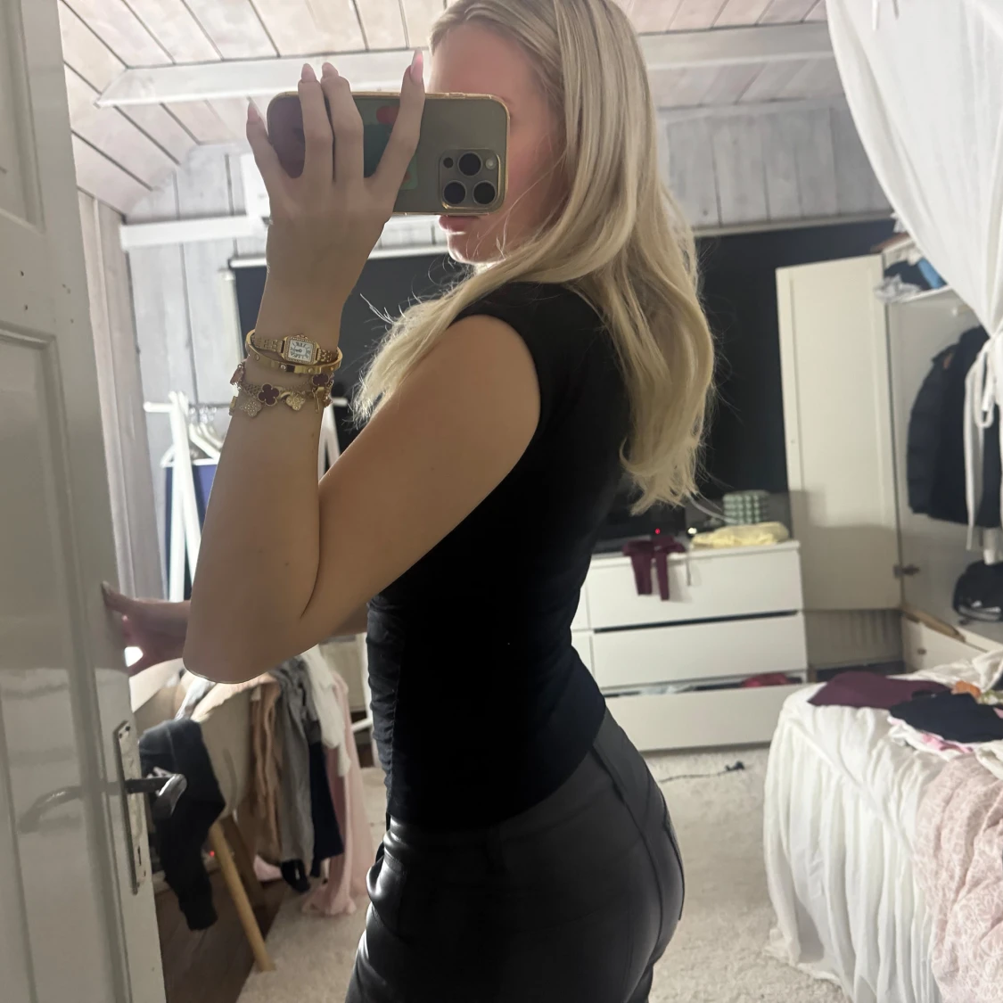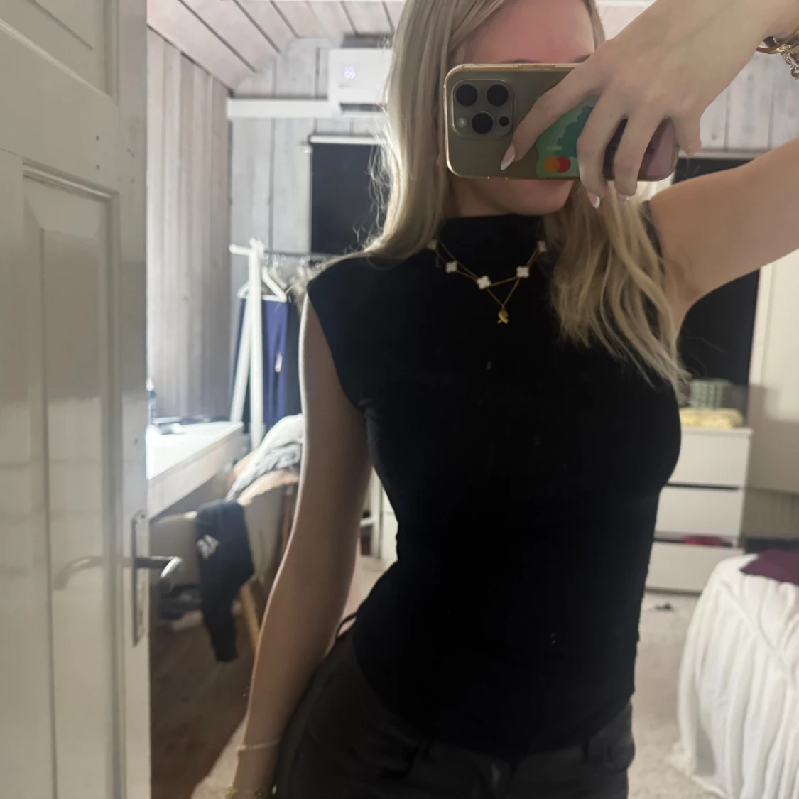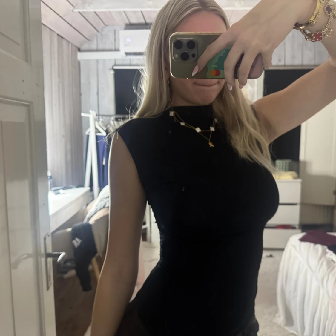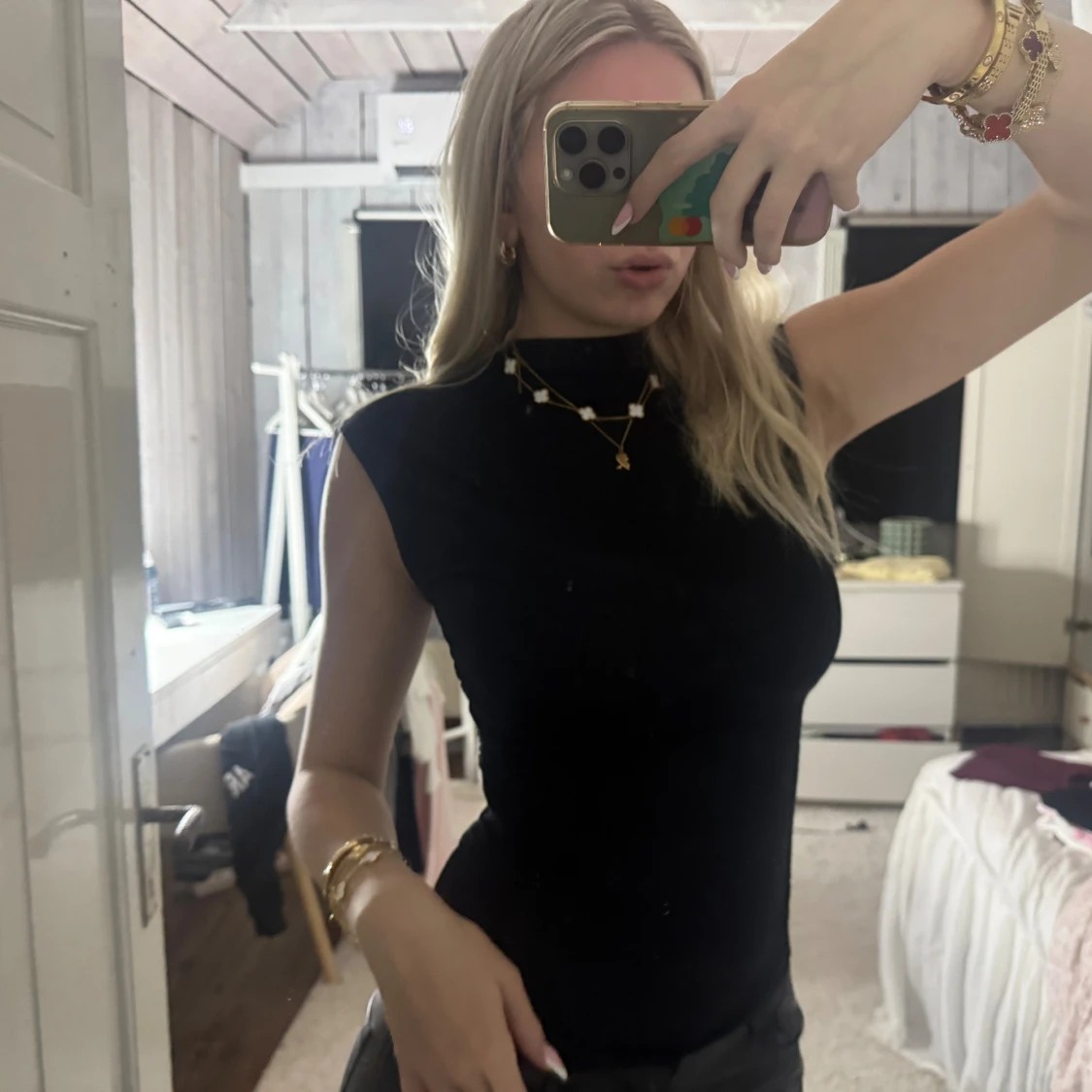 Säljer en svart, tight polotopp utan ärmar. Toppen har hög hals och en stilren, minimalistisk look som sitter figurnära. Perfekt att styla med smycken eller under en kavaj. Materialet känns mjukt och stretchigt.