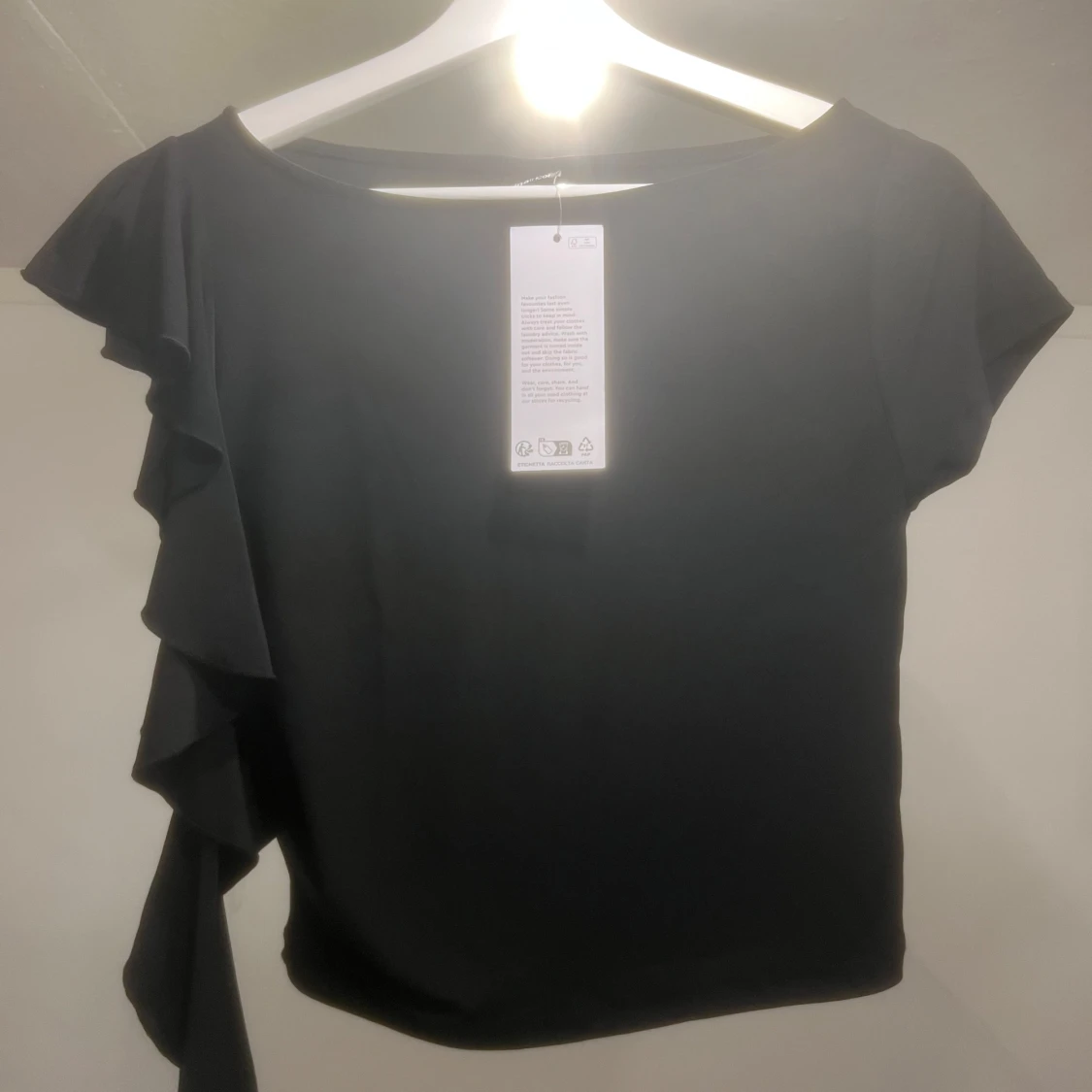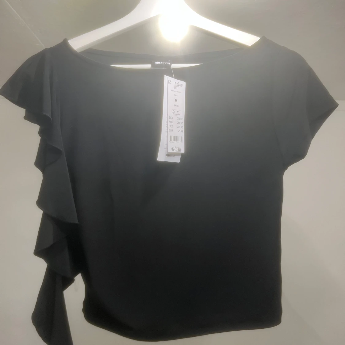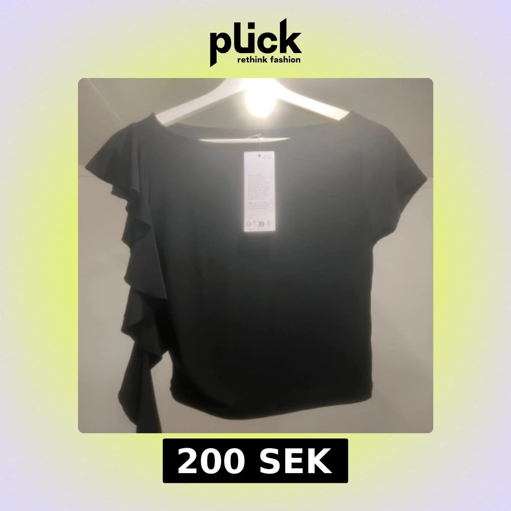 Snygg svart topp från GinaTricot med en unik volangdetalj på ena sidan. Toppen har korta ärmar och en rund halsringning. Perfekt för en stilren look. Aldrig använd