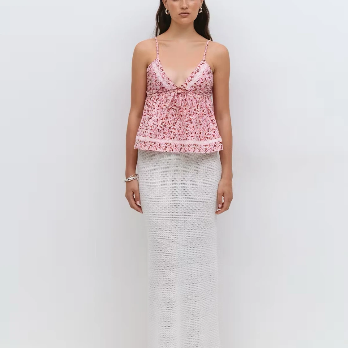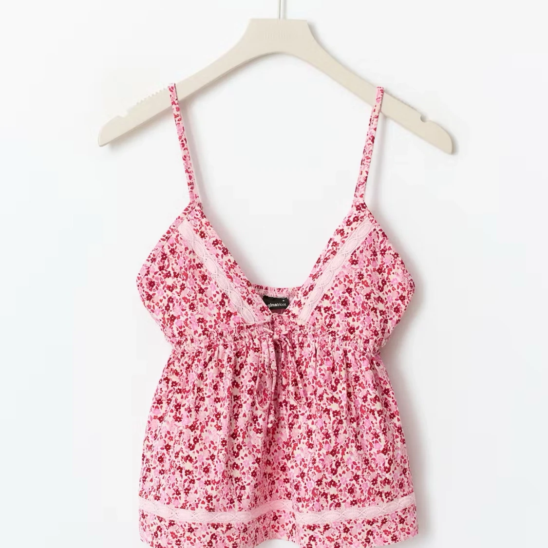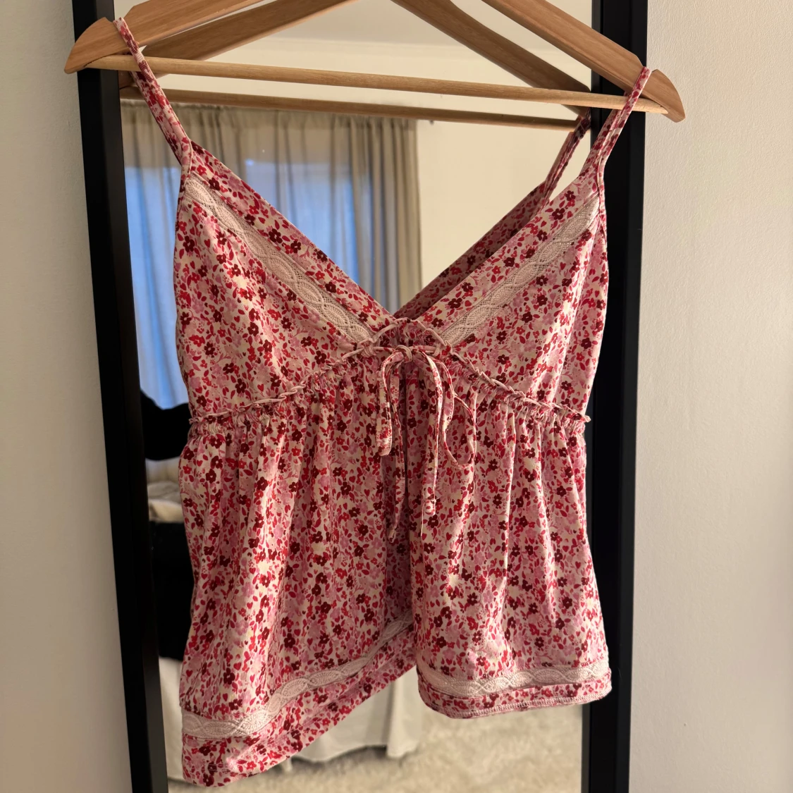Supersöt rosa linnetopp med små röda och rosa blommor, spetsdetaljer och knyt framtill. Tunn och luftig med smala axelband och v-ringad hals. Använd fåtal gånger så är i nyskick. Helt slutsåld på hemsidan💗