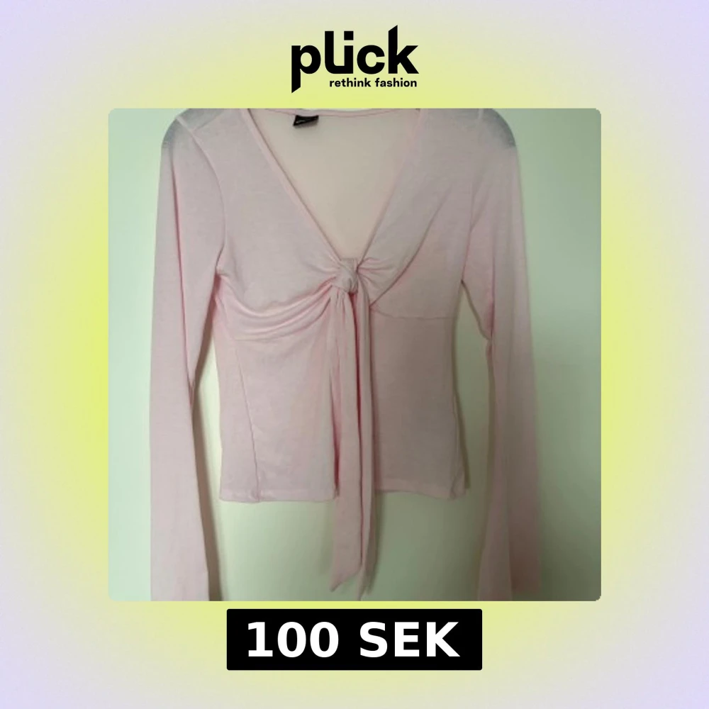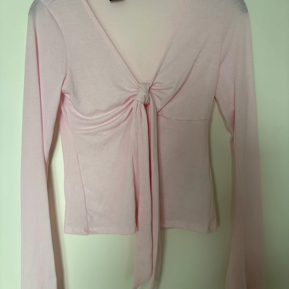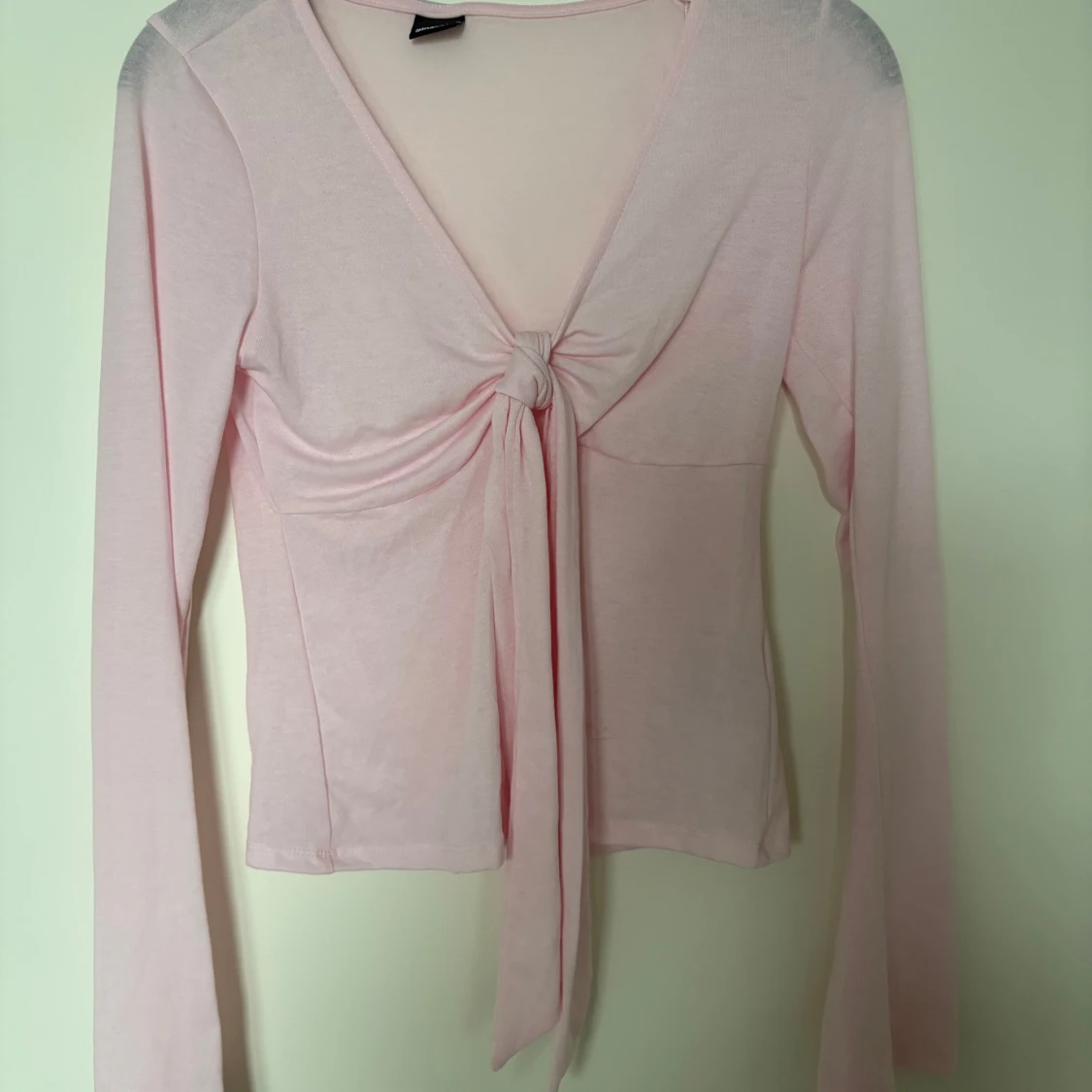 Supersöt ljusrosa långärmad topp från Gina Tricot med v-ringning och knyt framtill. Tunn och mjuk i materialet, perfekt för lager-på-lager eller som den är. Snygg croppad passform och långa ärmar ger en trendig vibe.