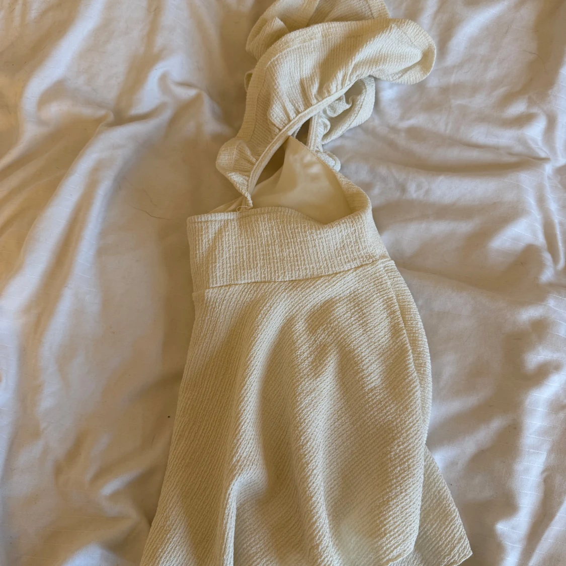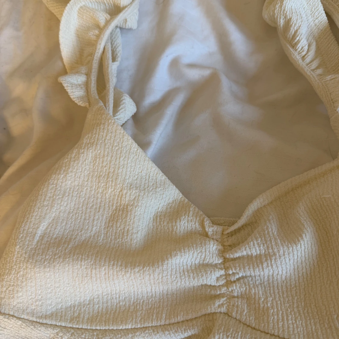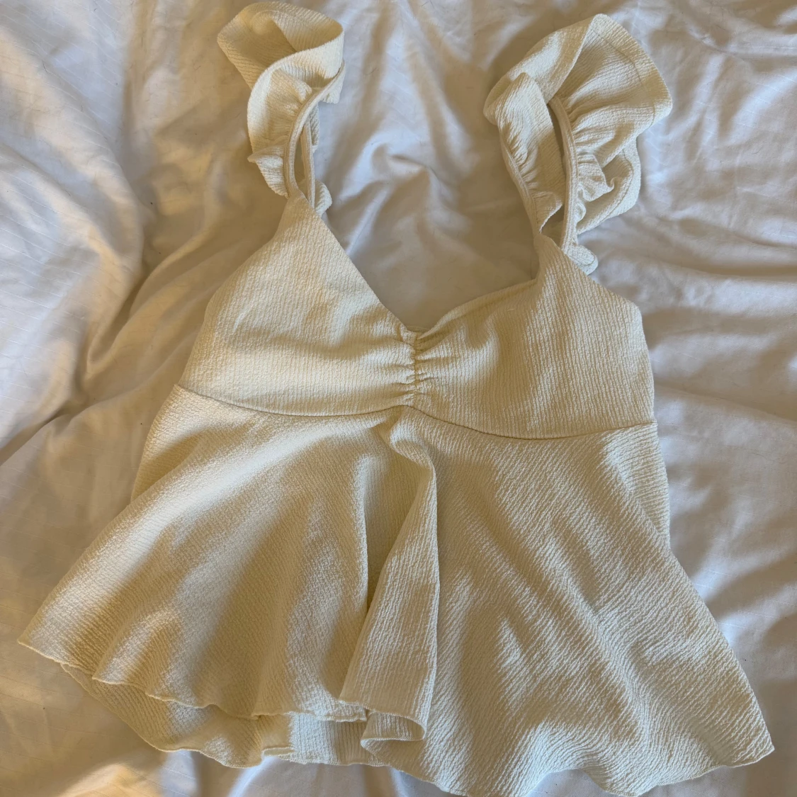 Supersöt krämvit linnetopp med volangiga axelband och lätt rynk framtill. Toppen har en v-ringad skärning och är sydd i ett strukturerat, lite stretchigt tyg som ger en lyxig känsla. Perfekt för varma dagar när du vill känna dig extra fin.