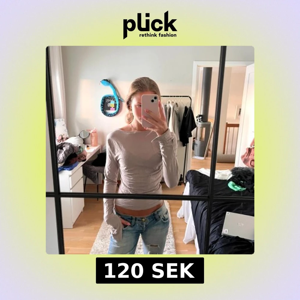 Säljer en stilren beige långärmad topp med en tight passform. Toppen har en rund halsringning och är perfekt för en avslappnad look. Går att ha åt båda håll