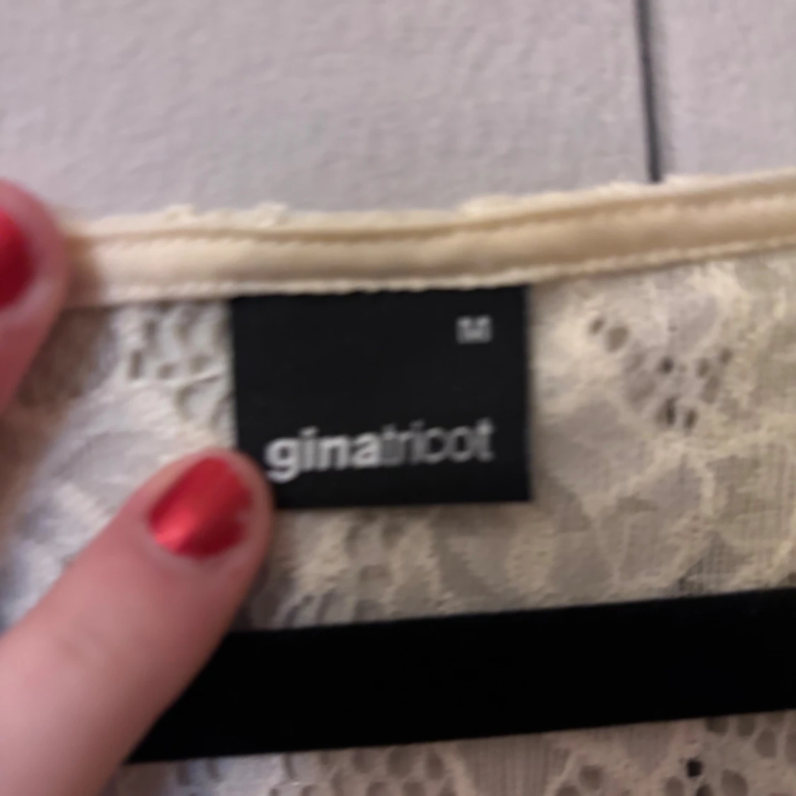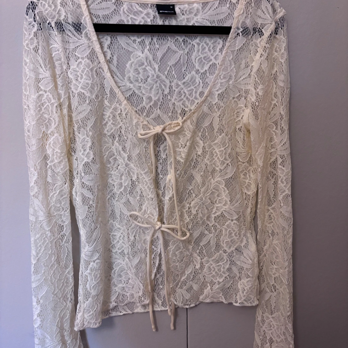 Superfin smörgul spetsblus från Gina Tricot i storlek M. Blusen har långa ärmar, v-ringning och två knyt framtill. Hela toppen är i blommig spets som ger en romantisk och trendig look. Perfekt att styla med jeans eller kjol för en cool outfit.