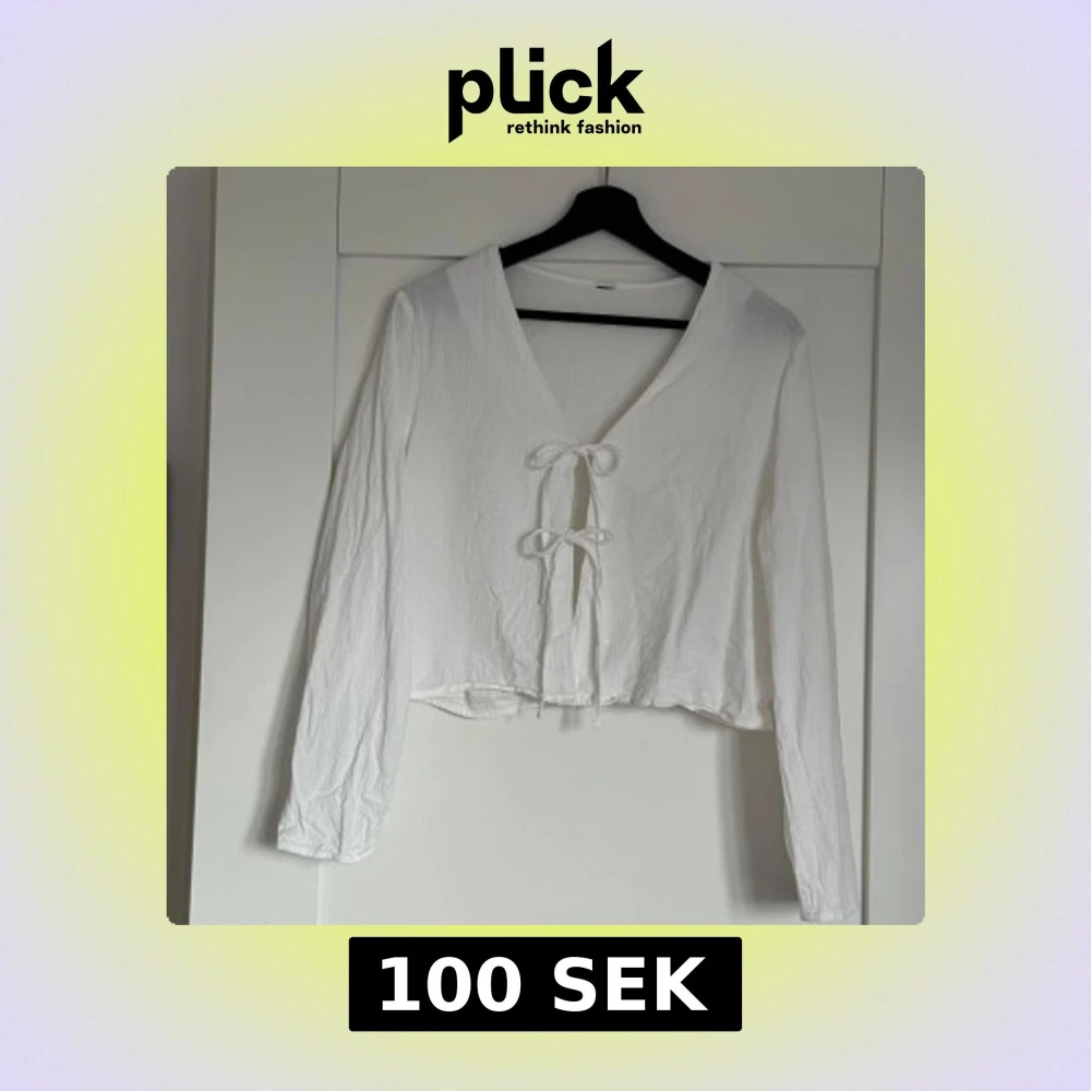 Säljer en vit blus med långa ärmar och två söta knyt framtill. Toppen har v-ringning och är lätt croppad, perfekt att styla med jeans eller kjol. Tunt och luftigt material som känns skönt mot huden.