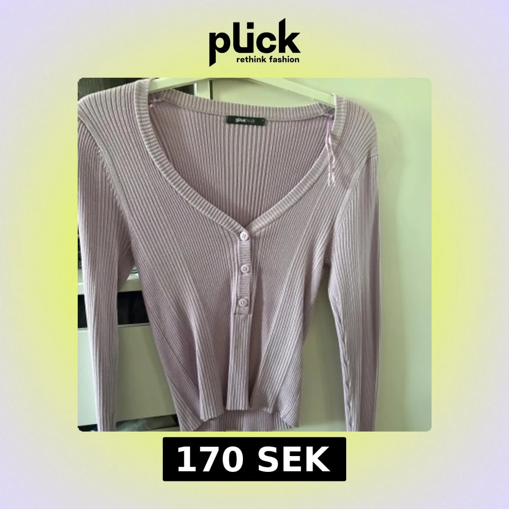 Superfin ljuslila ribbad topp från Gina Tricot med v-ringning och knappar framtill. Toppen har lång ärm och croppad passform, perfekt att styla med höga jeans eller kjol. Enkel men ändå trendig med sitt ribbade material och snygga detaljer.