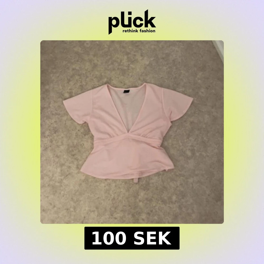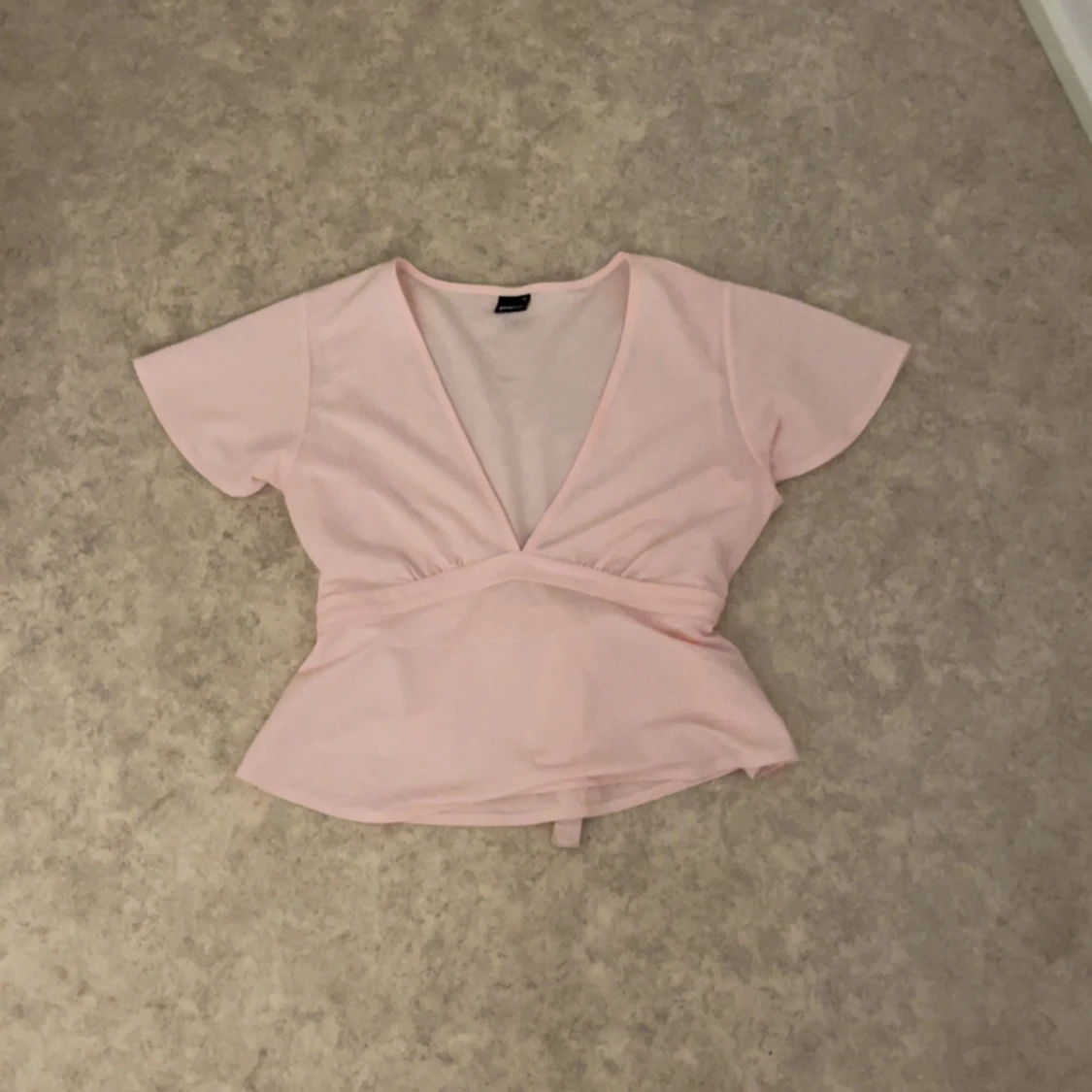 Supersöt ljusrosa omlottopp med v-ringning och korta ärmar. Toppen har ett brett knytband i midjan som ger en snygg siluett och volangliknande nederdel. Perfekt för dig som gillar en feminin och trendig stil.
