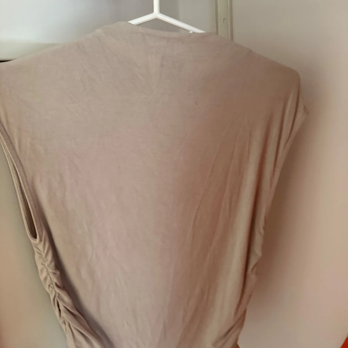 Säljer en stilren beige ärmlös topp från Gina Tricot. Toppen har en enkel, rak passform med breda axlar och rund halsringning. Perfekt att matcha med jeans eller kjol för en clean look.