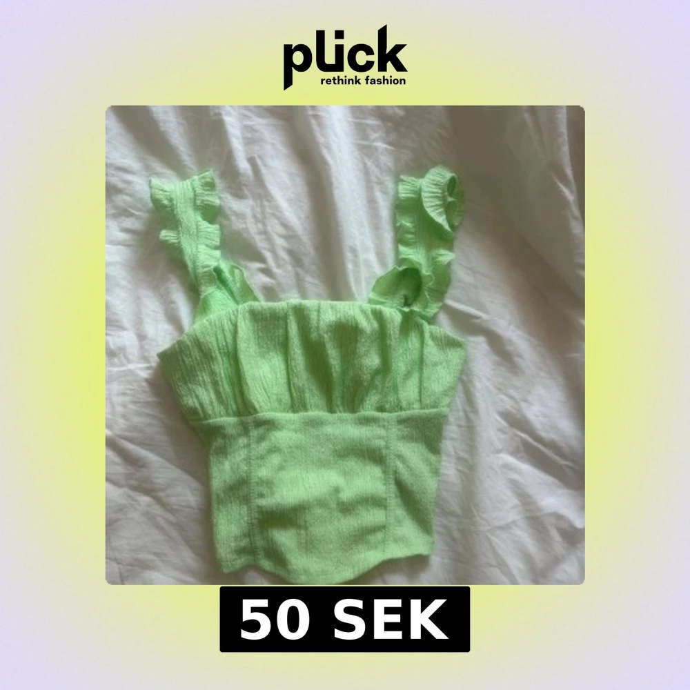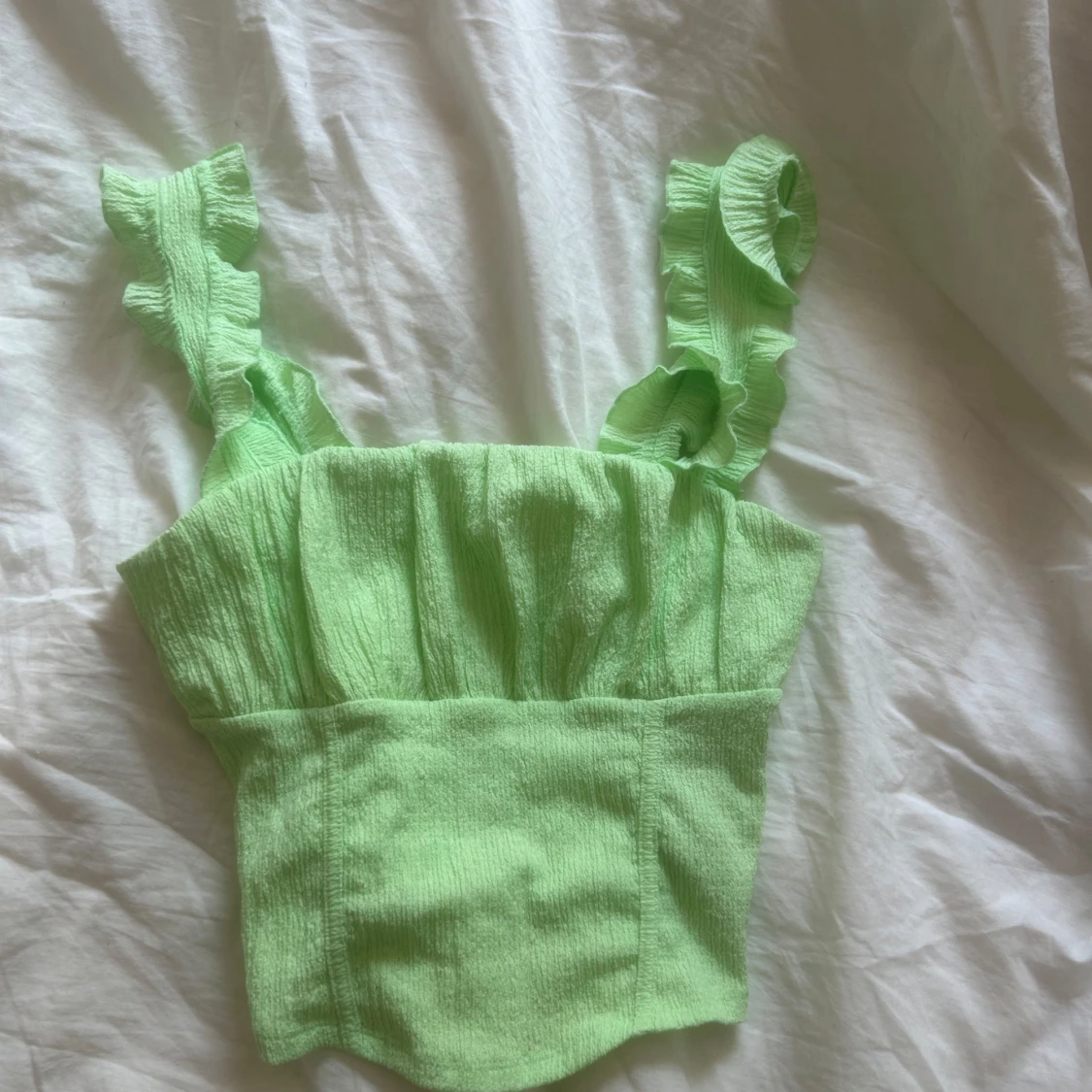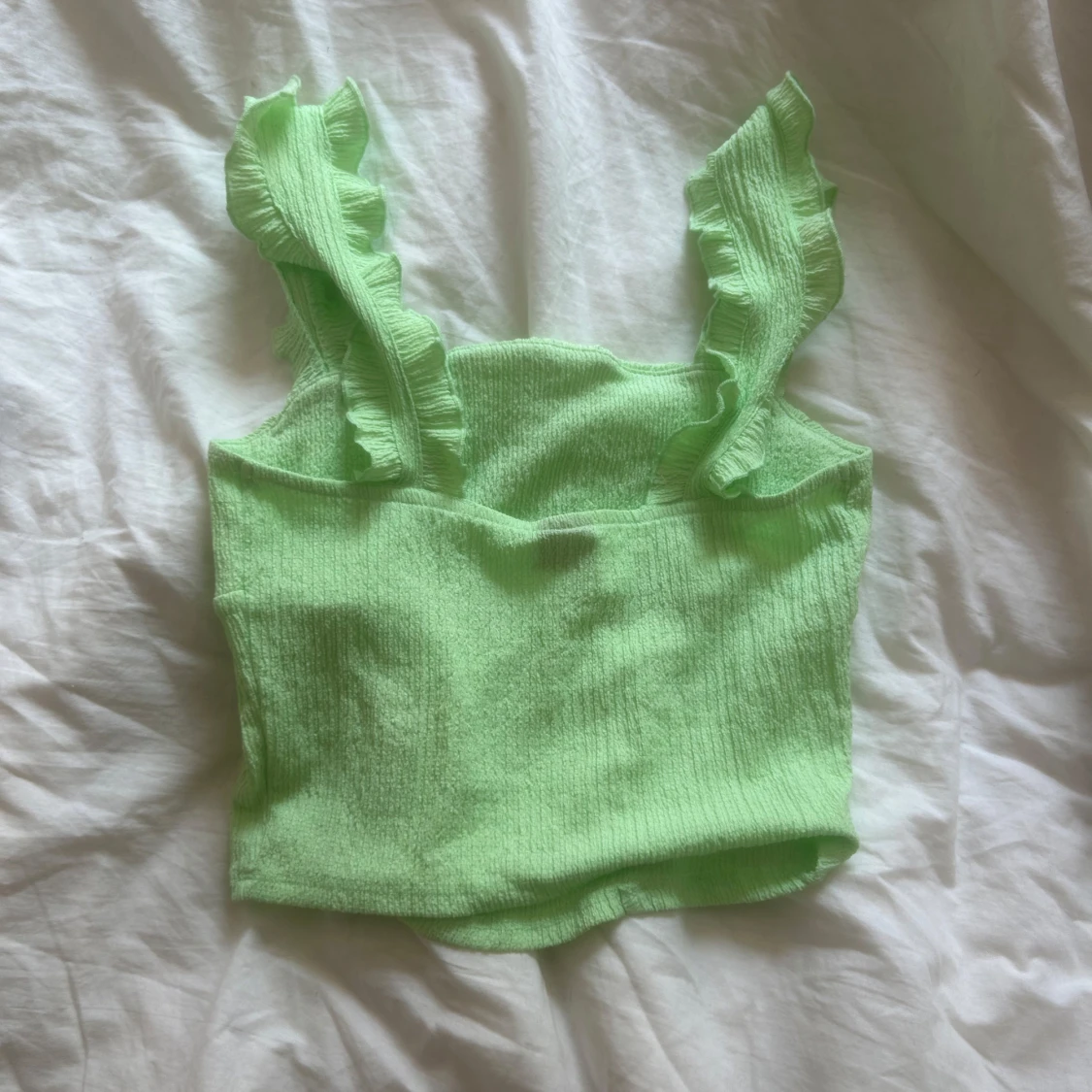 Superfin ljusgrön linnetopp med breda axelband dekorerade med volanger. Toppen är croppad. Perfekt för varma dagar och ger en fräsch vibe till din outfit. Den passar folk med storleken S också