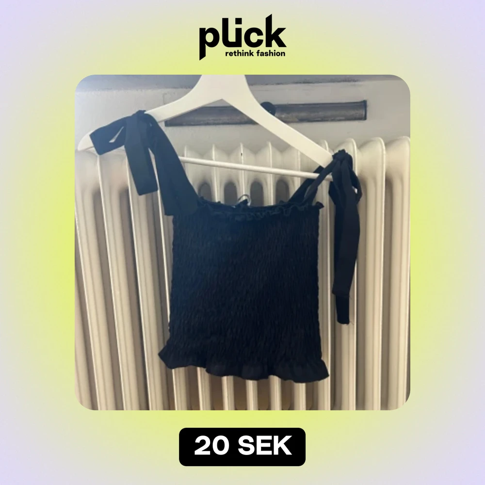 En svart tubtopp med knytband på axlarna. Toppen har en rynkad design och volangdetaljer vid nederkanten.