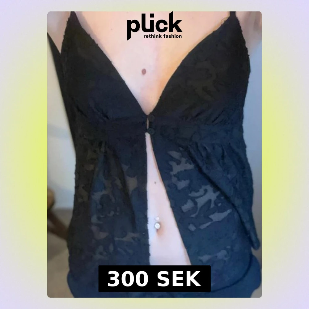 Säljer en svart linnetopp med tunna axelband och v-ringning. Toppen är i transparent spets med blommigt mönster och har två knappar framtill. Den är croppad och har en luftig passform som ger en snygg och trendig look.