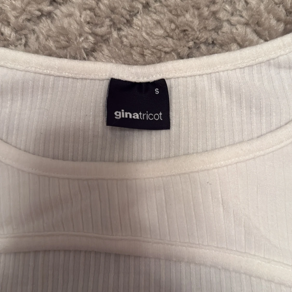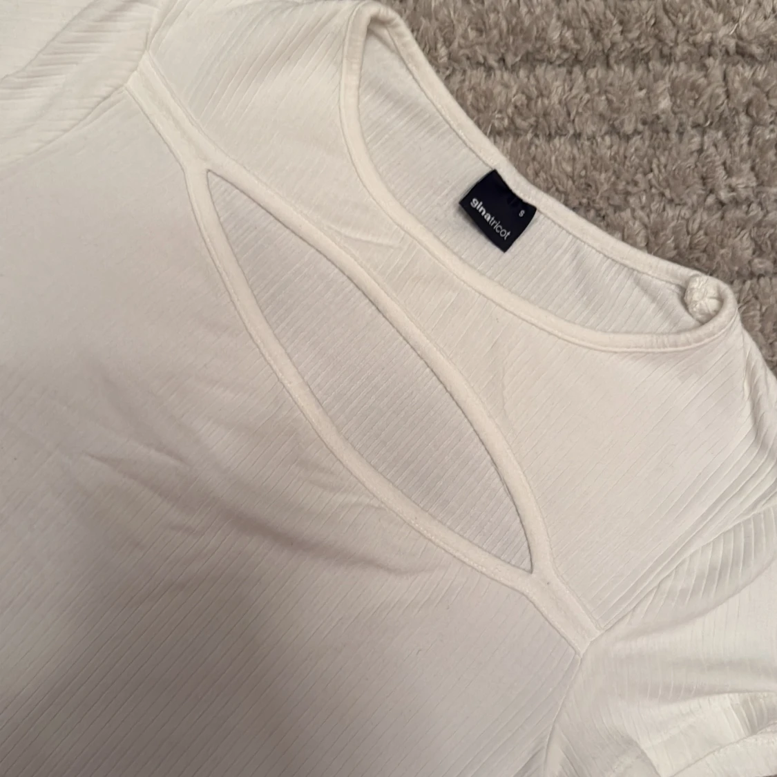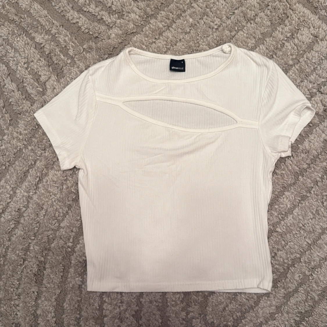 Vit ribbad topp från Gina Tricot i storlek S. Modellen är croppad med korta ärmar och har en snygg cut out-detalj framtill vid bröstet. Tunt och stretchigt material som känns skönt mot huden. Perfekt för dig som gillar trendiga detaljer och enkel stil.