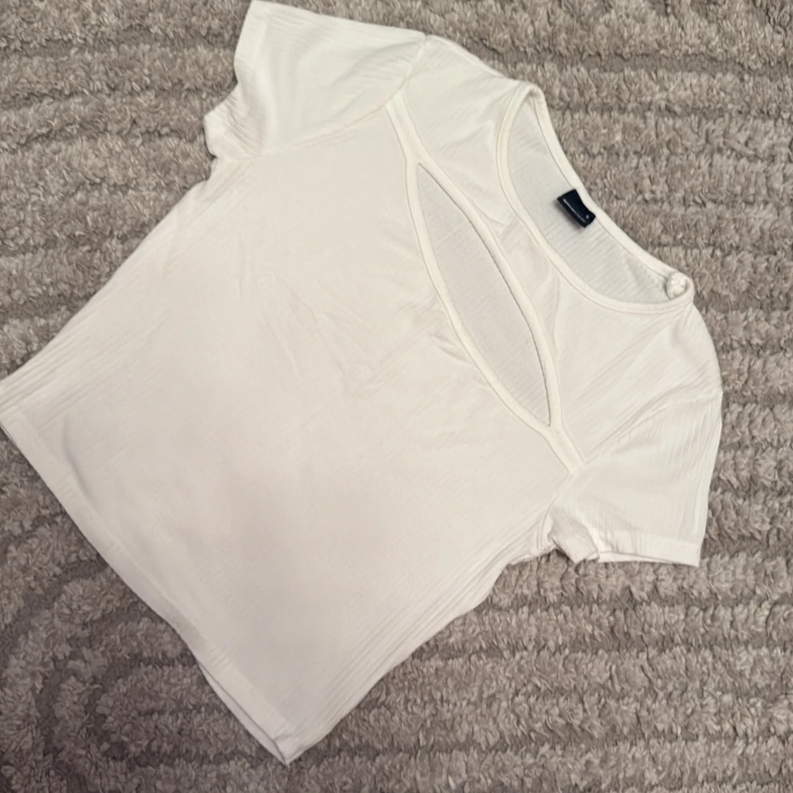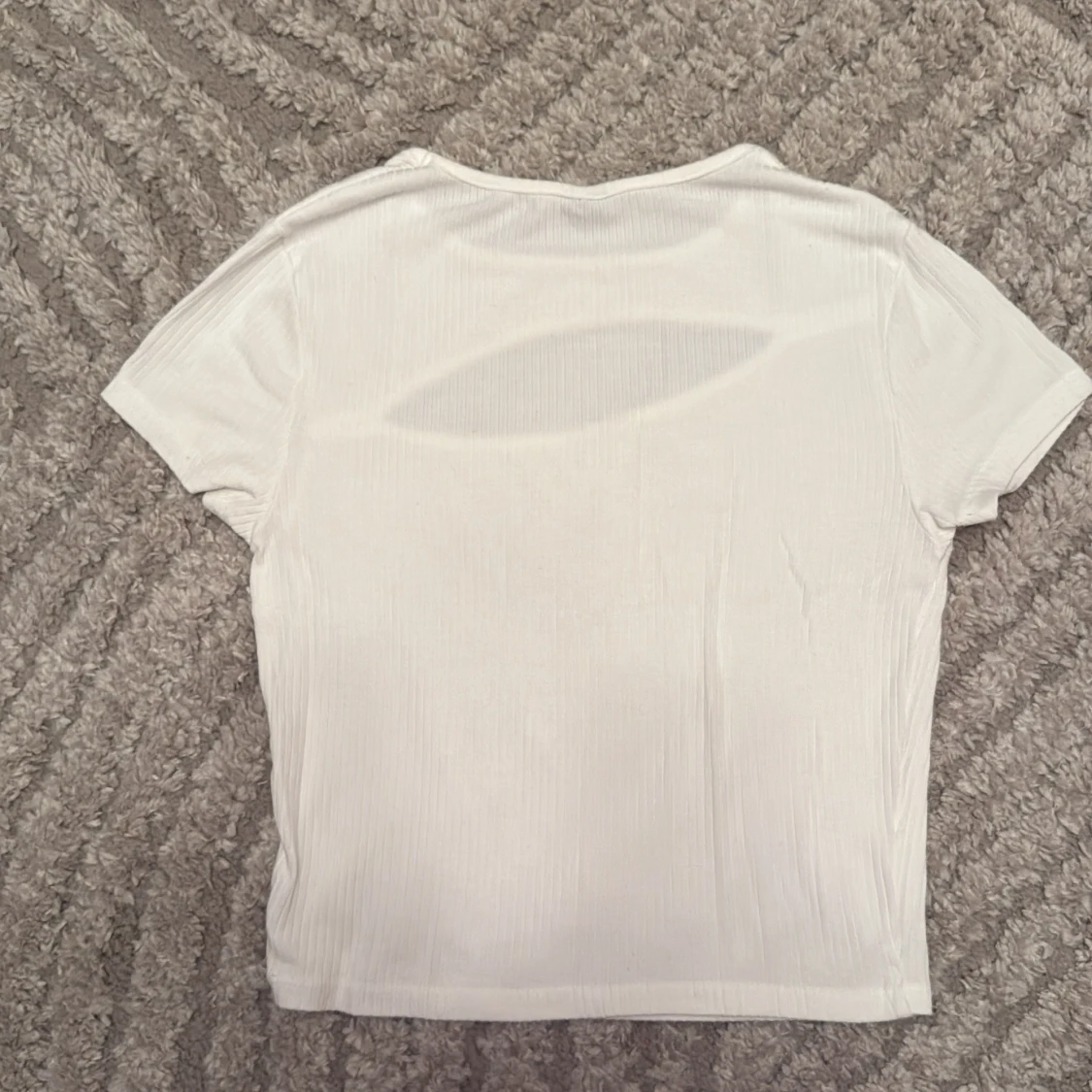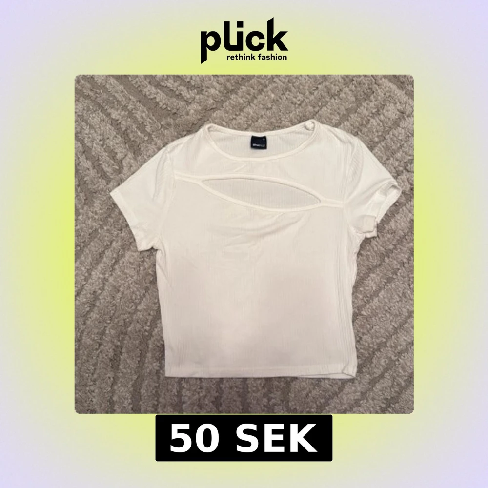 Vit ribbad topp från Gina Tricot i storlek S. Modellen är croppad med korta ärmar och har en snygg cut out-detalj framtill vid bröstet. Tunt och stretchigt material som känns skönt mot huden. Perfekt för dig som gillar trendiga detaljer och enkel stil.