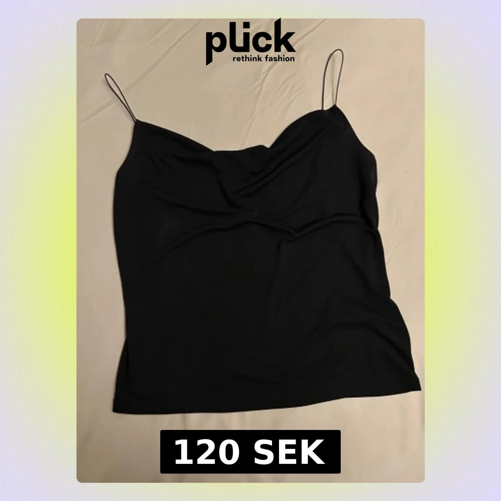 Svart linnetopp från Gina Tricot i storlek S. Tunn och mjuk polyester med smala axelband och lätt draperad front. Enkel och stilren design som är lätt att matcha med olika outfits. Perfekt för dig som gillar minimalistisk stil.