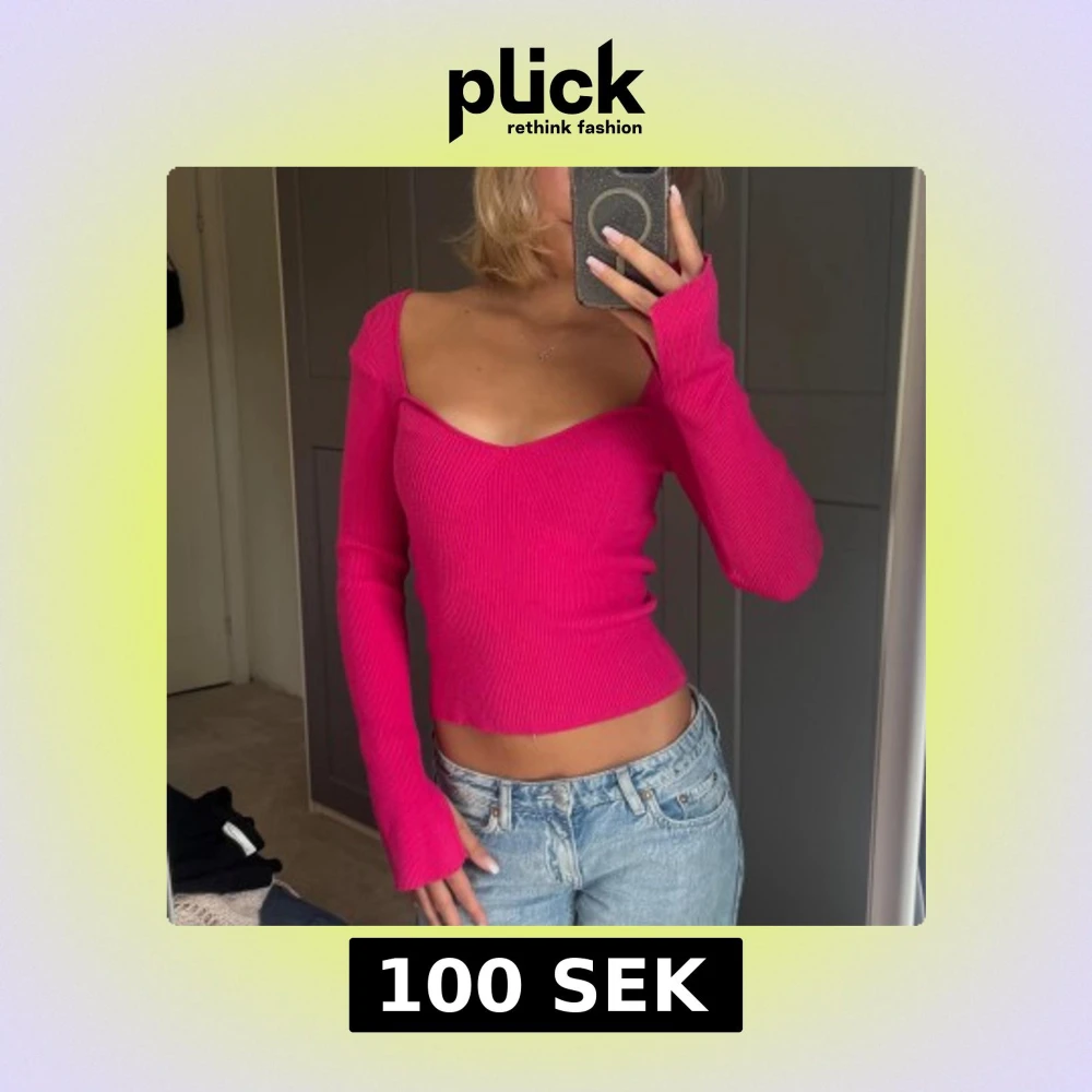 Säljer en snygg ribbad topp i stark rosa färg med lång ärm och djup v-ringning. Modellen är croppad och sitter tight. Materialet är stickat och stretchigt för en bekväm passform.