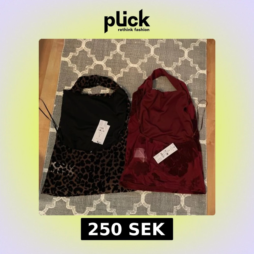 Två nya singlet toppar i storlek S. Ena är vinröd med vattenfallsringning och sammetsliknande blommönster, den andra är svart med leopardmönstrad mesh och cowl neck.