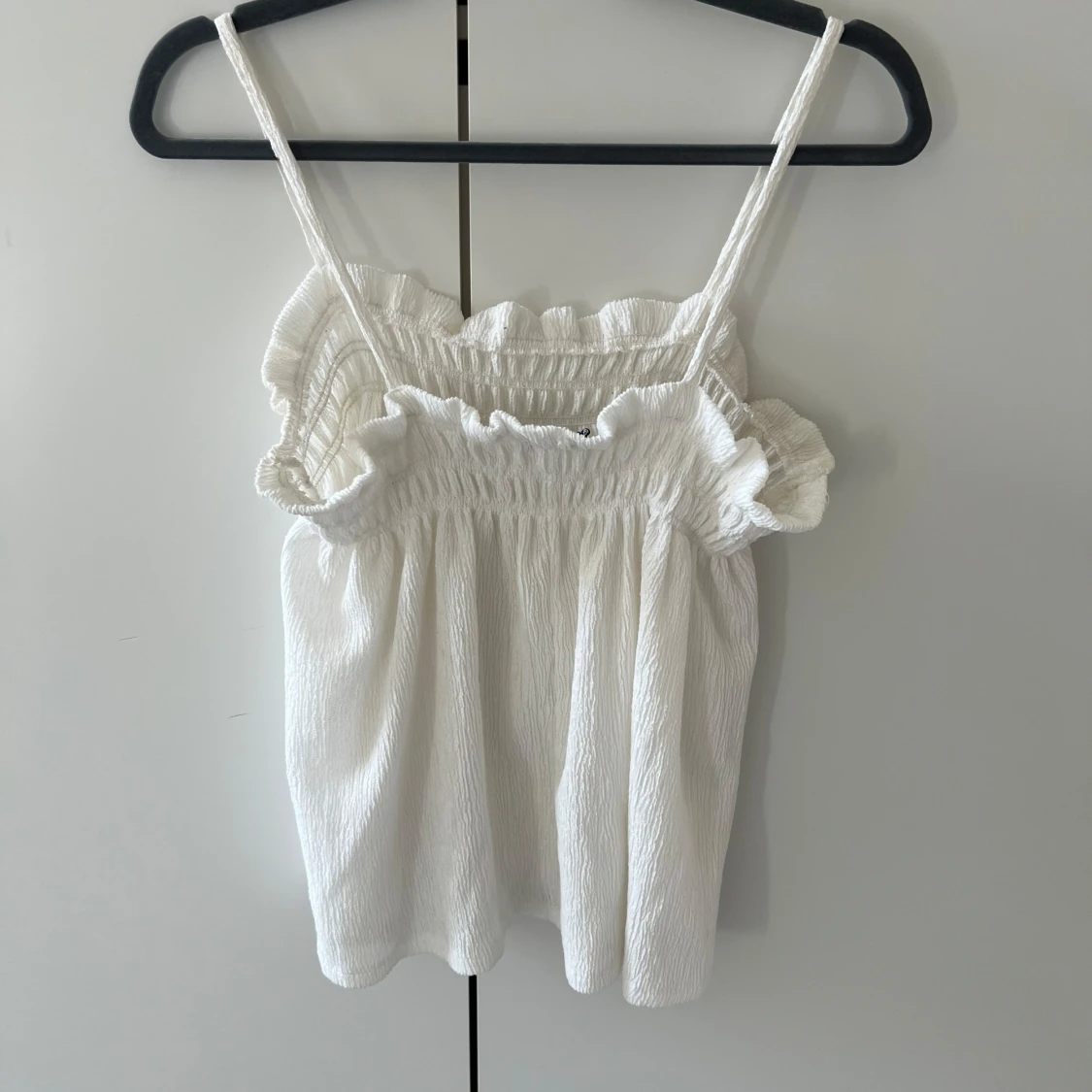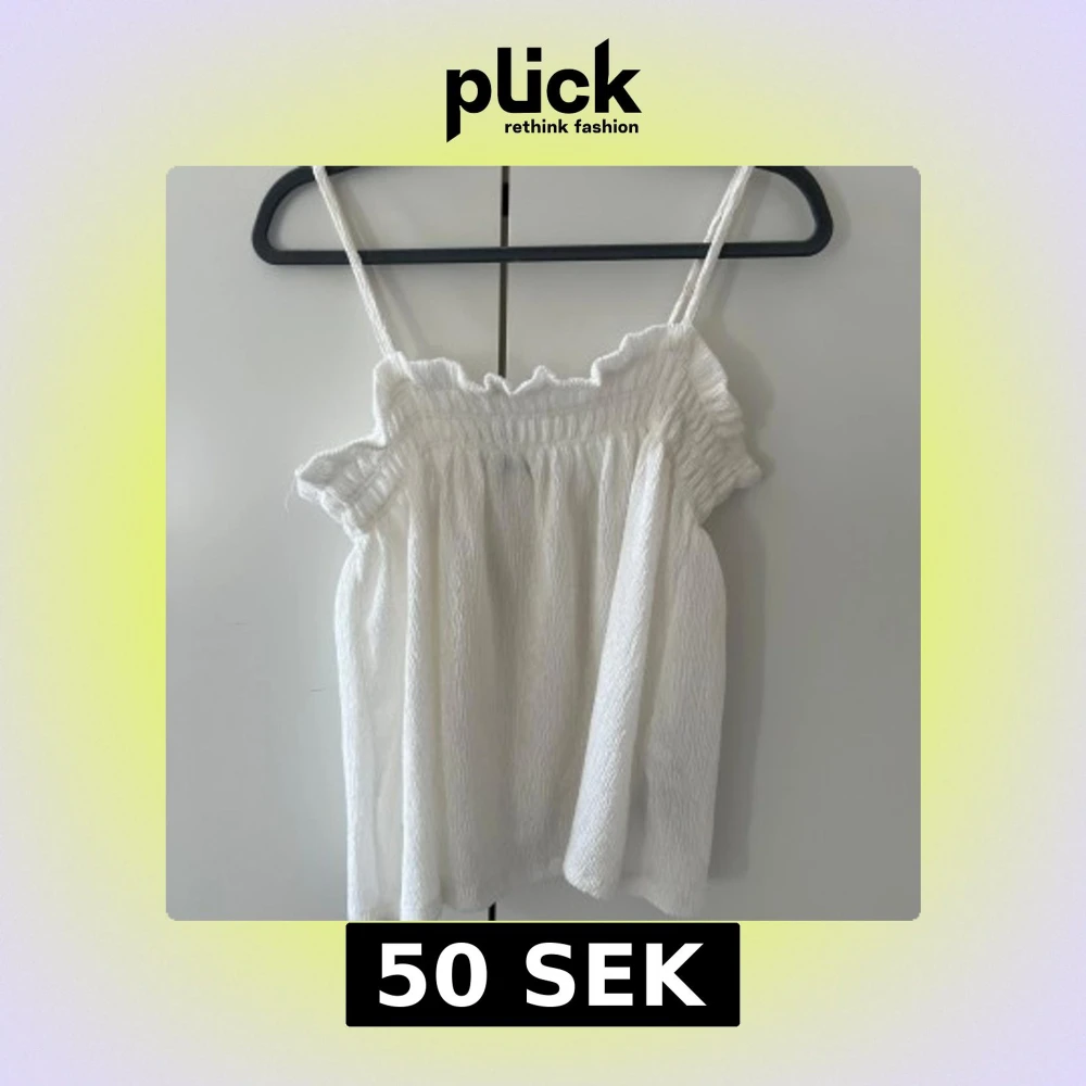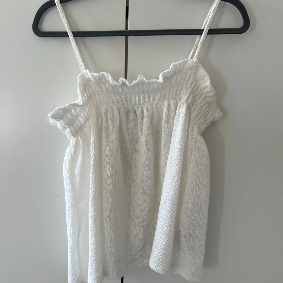Säljer en söt vit ärmlös topp med smala axelband och volangdetaljer vid halsringningen. Perfekt för varma sommardagar. Toppen har en luftig och bekväm passform.