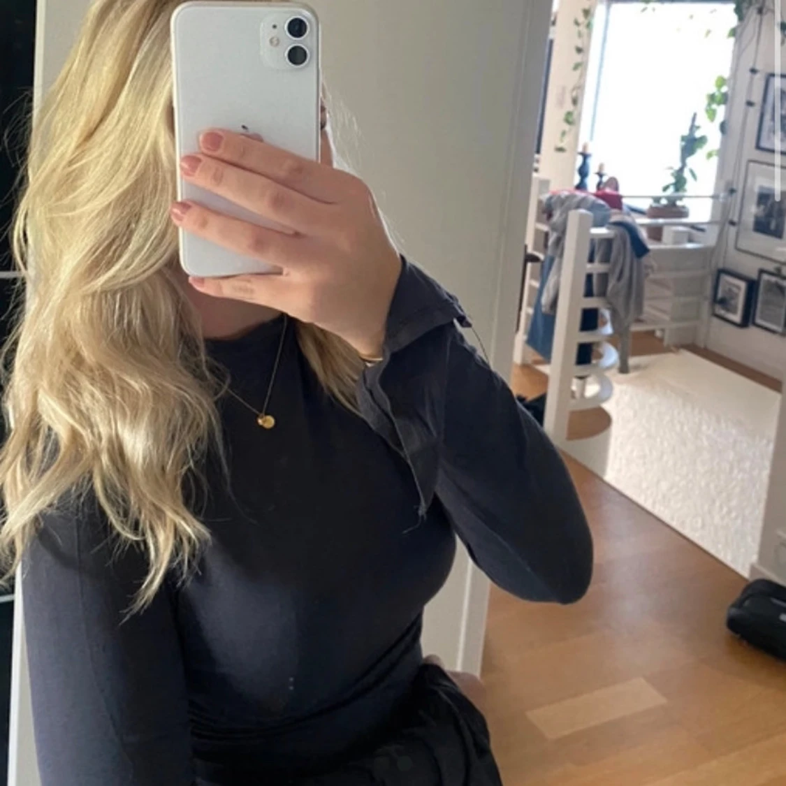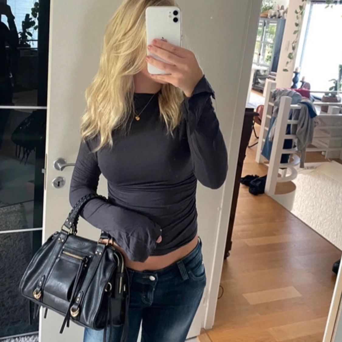 Säljer en mörkgrå långärmad croppad topp med tight passform. Toppen har rund halsringning och är tillverkad i ett stretchigt material som sitter snyggt på kroppen. Perfekt att styla med jeans eller kjol för en trendig look.