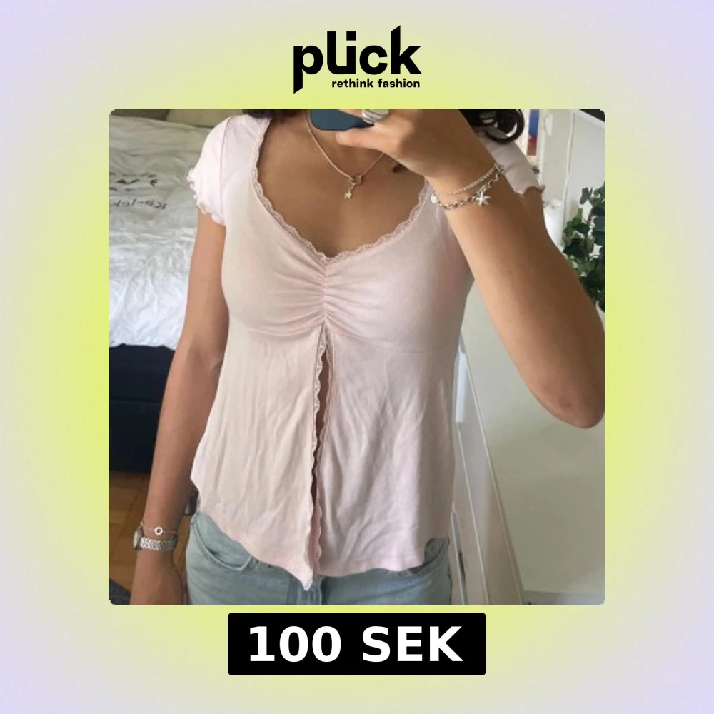 Supersöt ljusrosa topp från Gina Tricot med v-ringning, spetskant och rynkdetalj framtill. Korta ärmar med volangkant och en liten slits framtill.