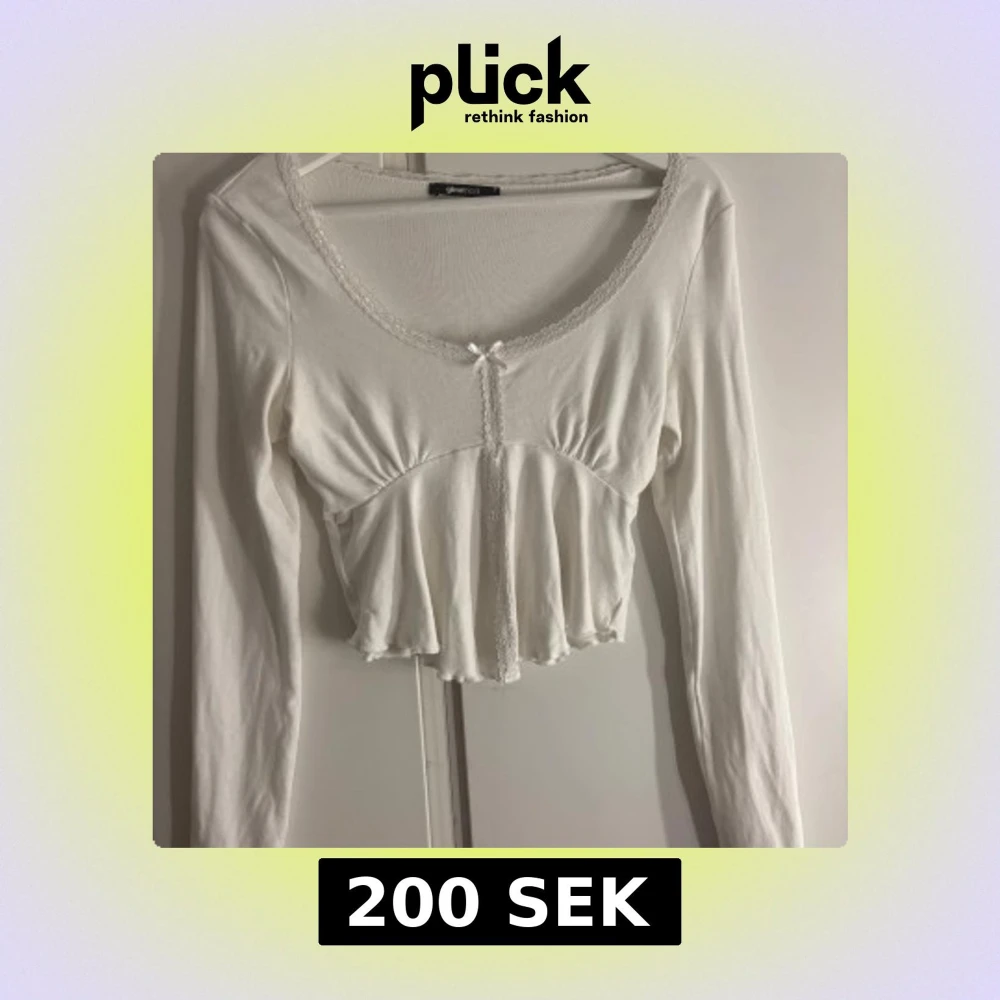 Supersöt vit croppad blus från Gina Tricot med långa ärmar, spetsdetaljer längs urringningen och en liten rosett framtill. Säljer den pga att den knappast kommer till användning.