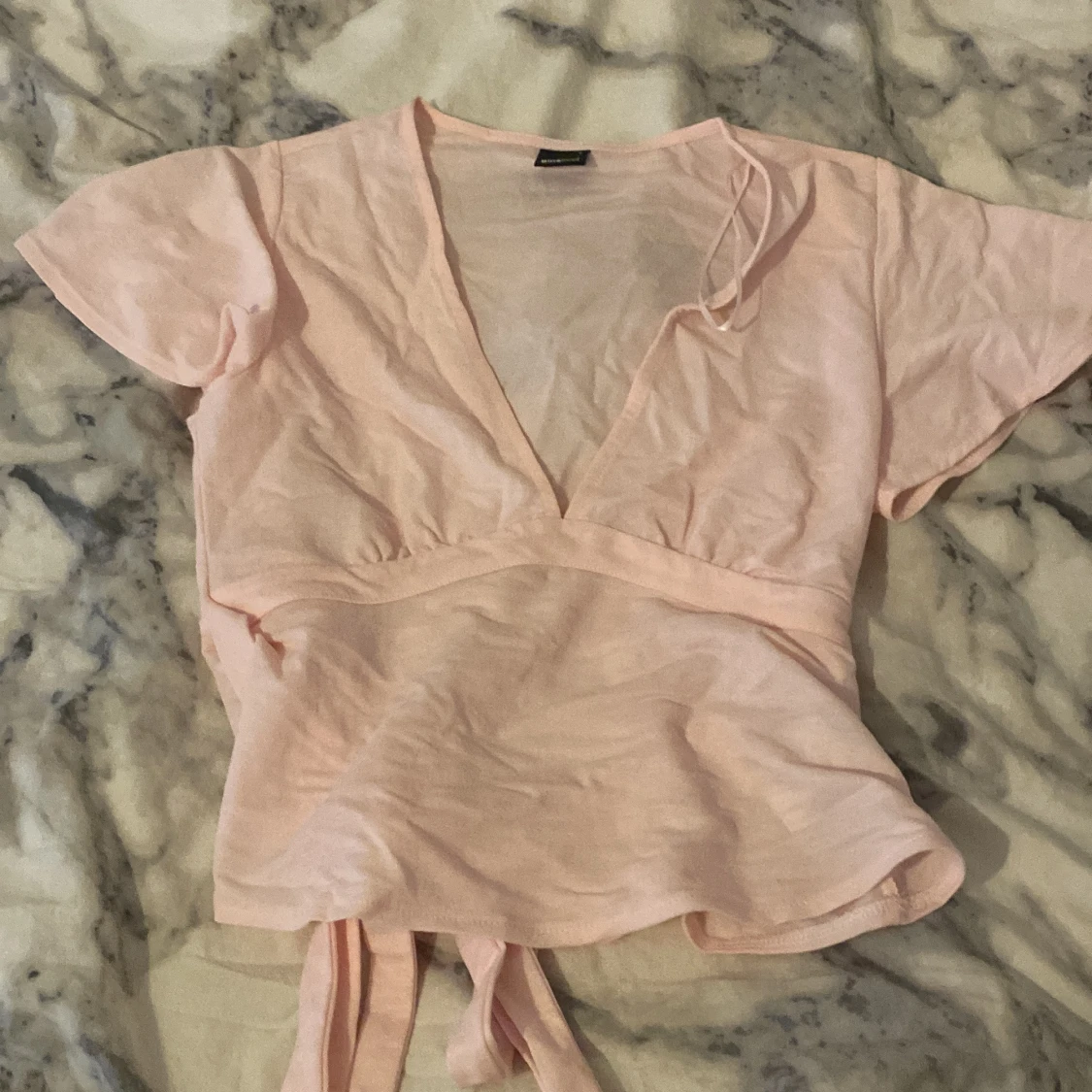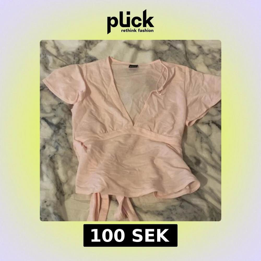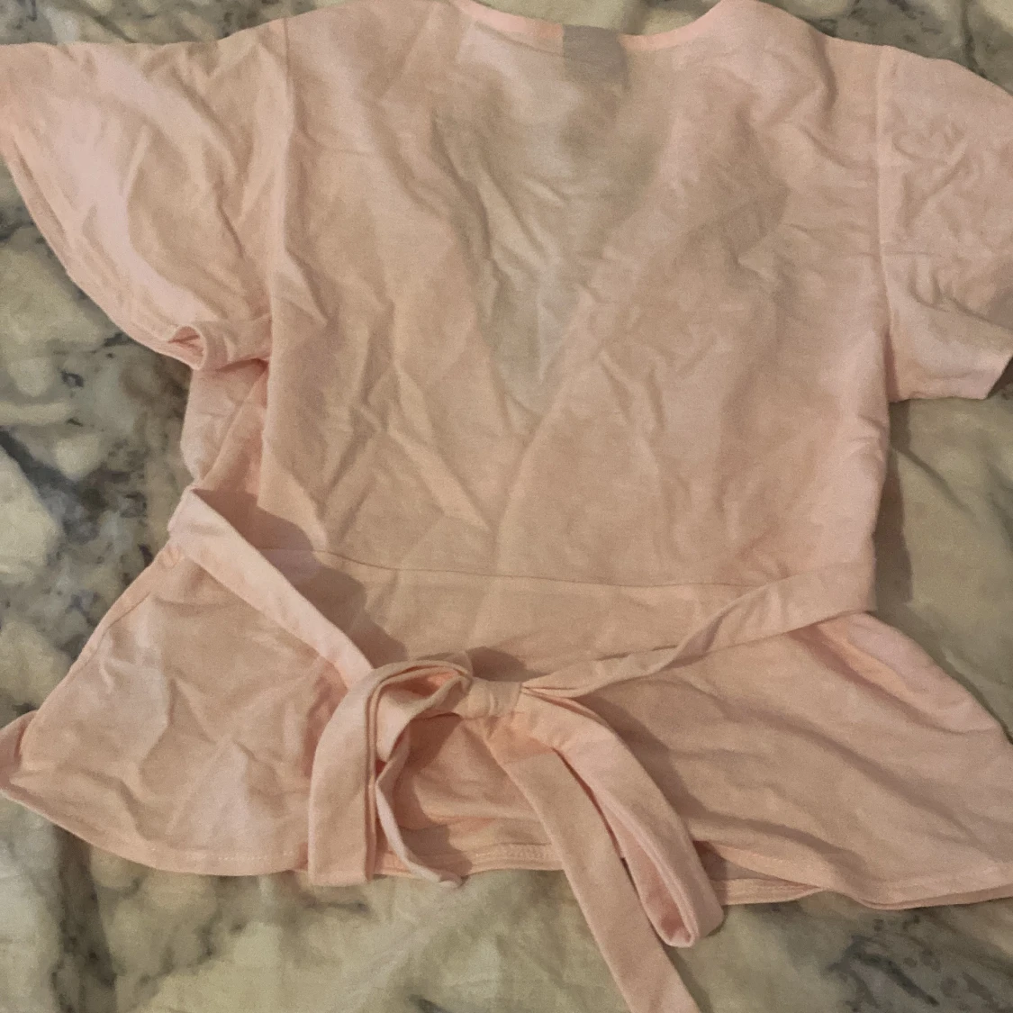 Säljer en ljusrosa omlottopp från Gina Tricot med korta ärmar och v-ringning. Toppen har knytband i midjan som ger en snygg siluett och är tillverkad i mjuk bomull. Perfekt för dig som gillar en feminin och chill stil. aldrig använd