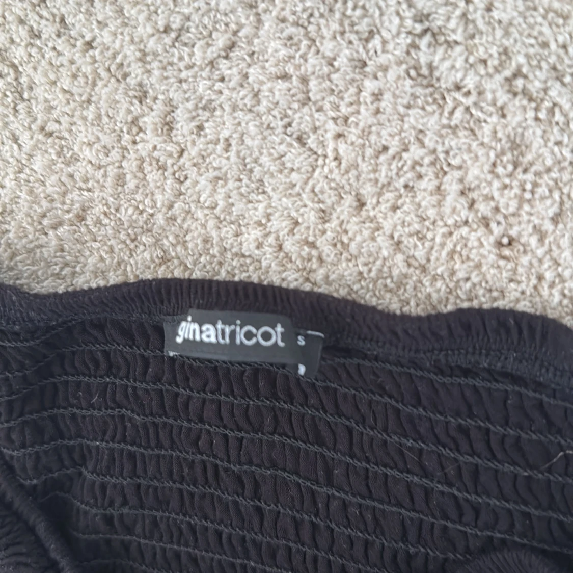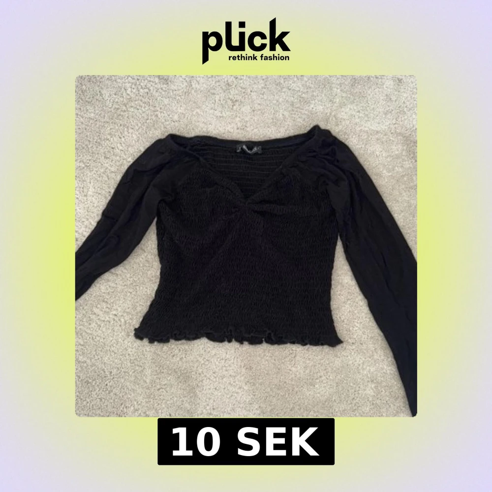 Supersnygg svart långärmad topp från Gina Tricot med smockad struktur och v-ringning. Toppen har en figurnära passform och lätt volangkant nertill. Perfekt att styla med jeans eller kjol för en trendig look.