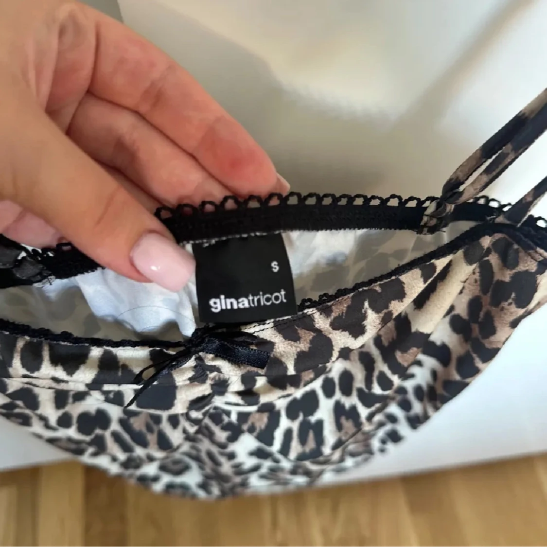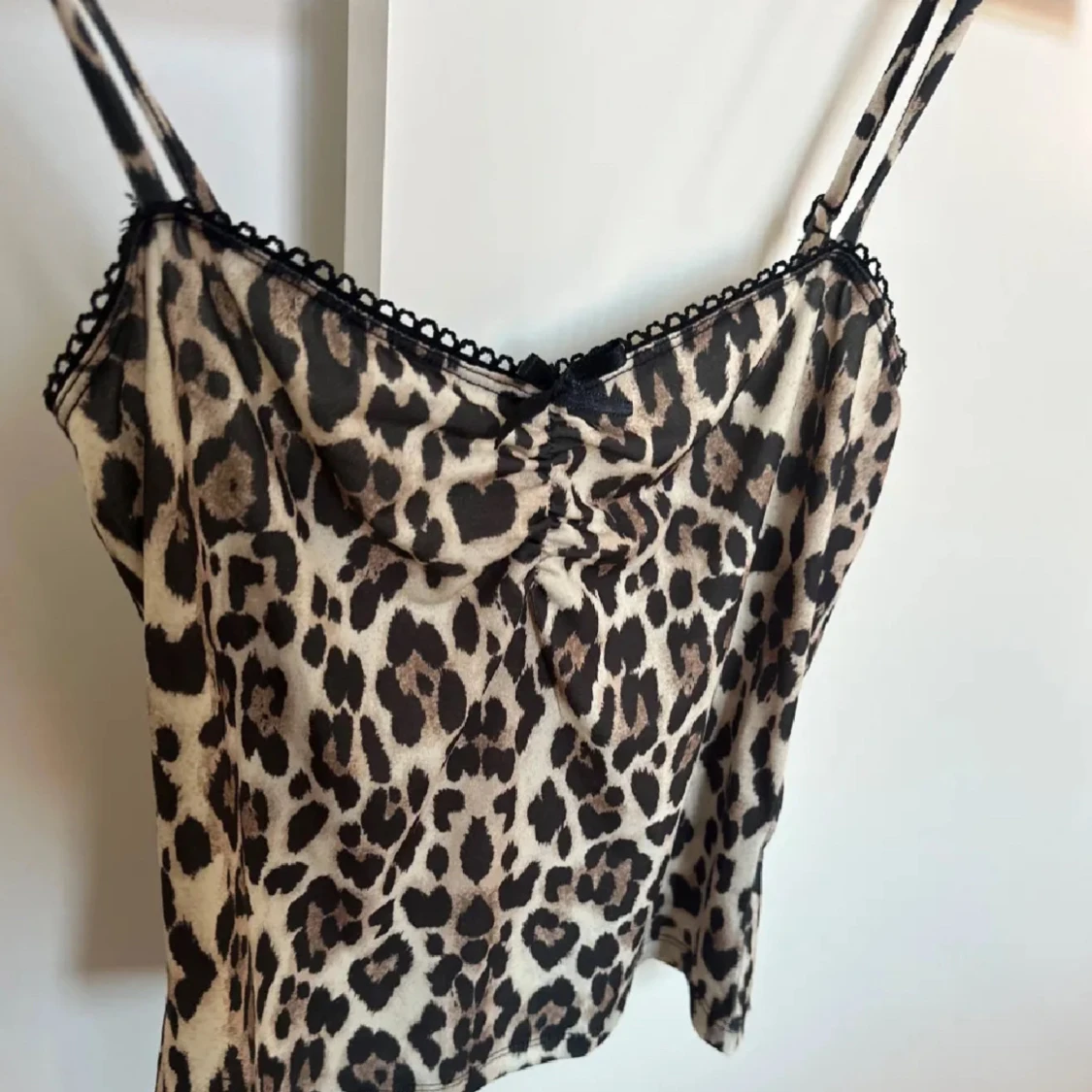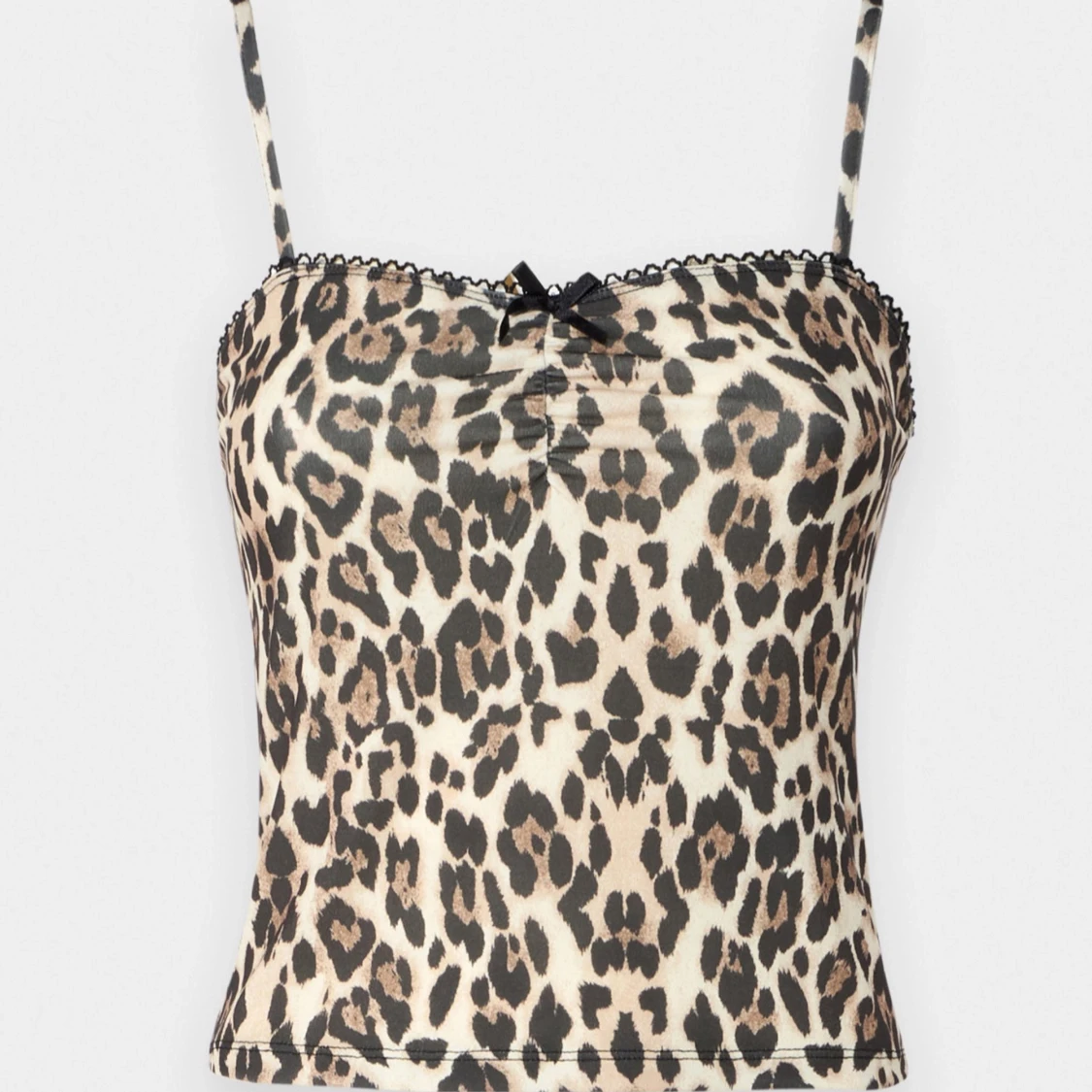 Säljer ett leopardmönstrat linne från Gina Tricot med tunna axelband och liten svart rosett framtill. Toppen har spetskant upptill och är i mjukt, stretchigt material. Perfekt för dig som vill sticka ut med ett djurmönster och cool vibe.