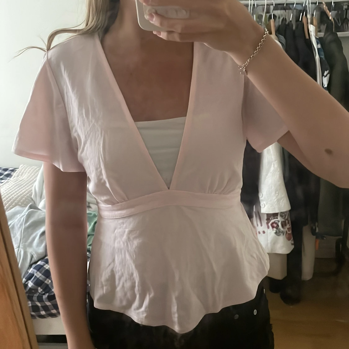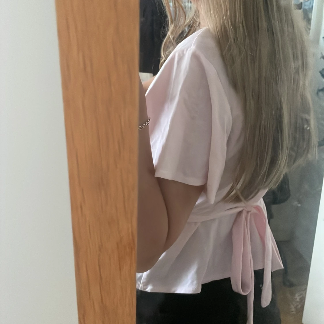 Supersöt ljusrosa omlottopp från Gina Tricot som har bara använts två gånger. Toppen har korta ärmar, v-ringning och knyt i ryggen för en snygg passform. Perfekt för dig som gillar en feminin och avslappnad stil.