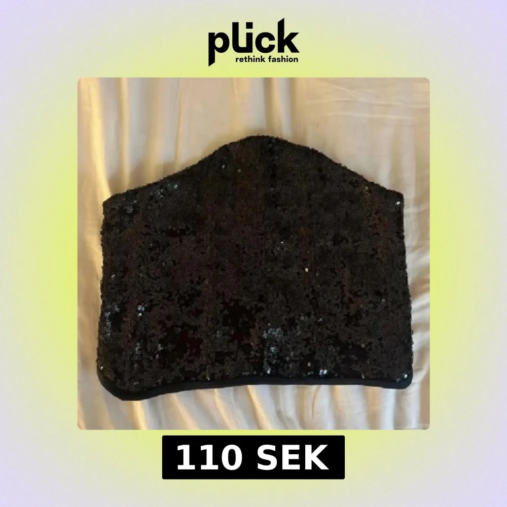 Säljer en svart korsett-topp med glittriga paljetter över hela ytan. Toppen har snörning baktill för justerbar passform och en snygg, strapless design. Perfekt för att sticka ut på festen med sin glansiga look och coola detaljer. Den perfekta toppen till nyår!