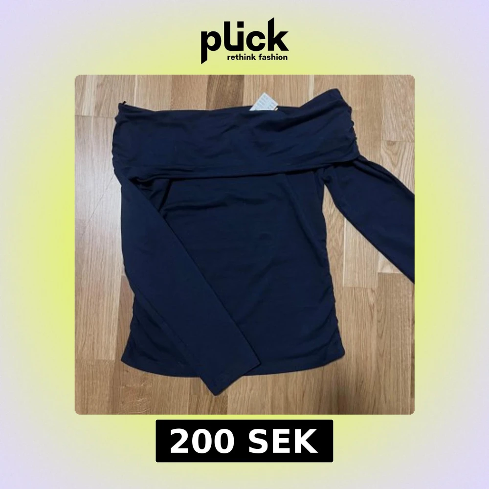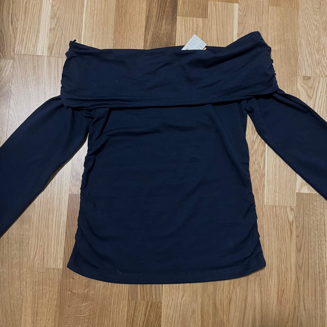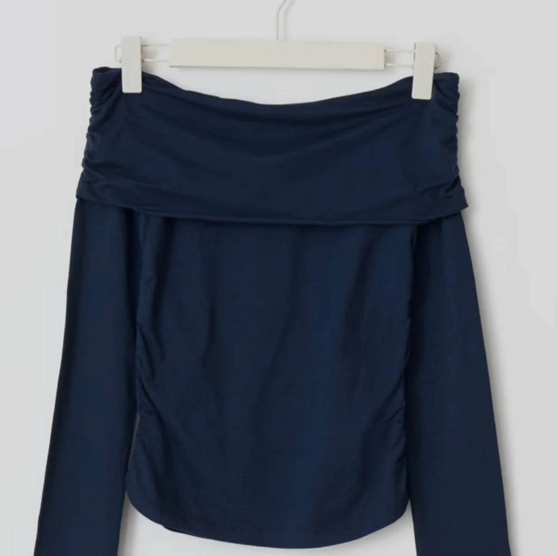 Längärmad off shoulder topp med rynkningar i sidorna. Toppen är marinbla och har nervikt ovankant. Det stảr storlek 170 men jag skulle säga att det passar S