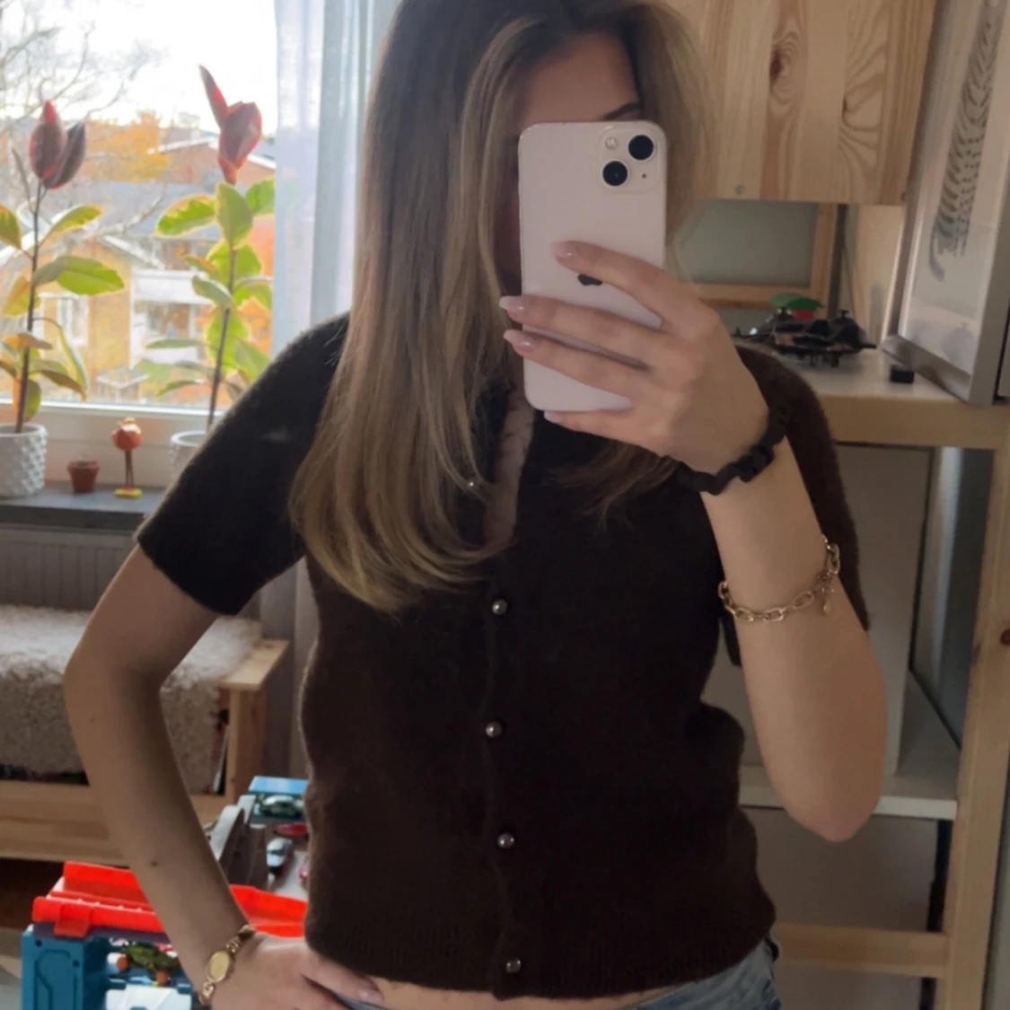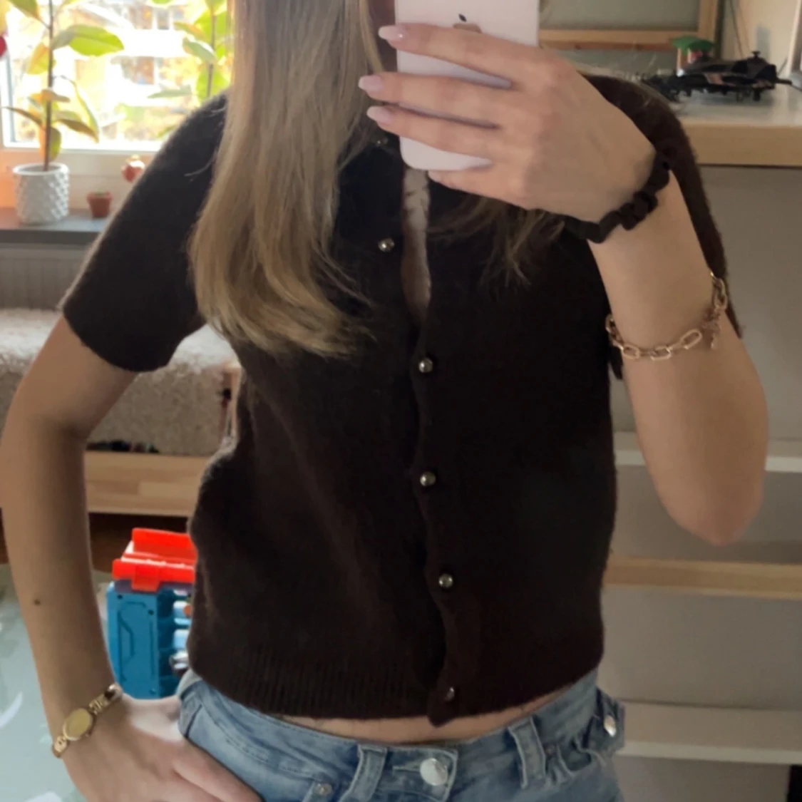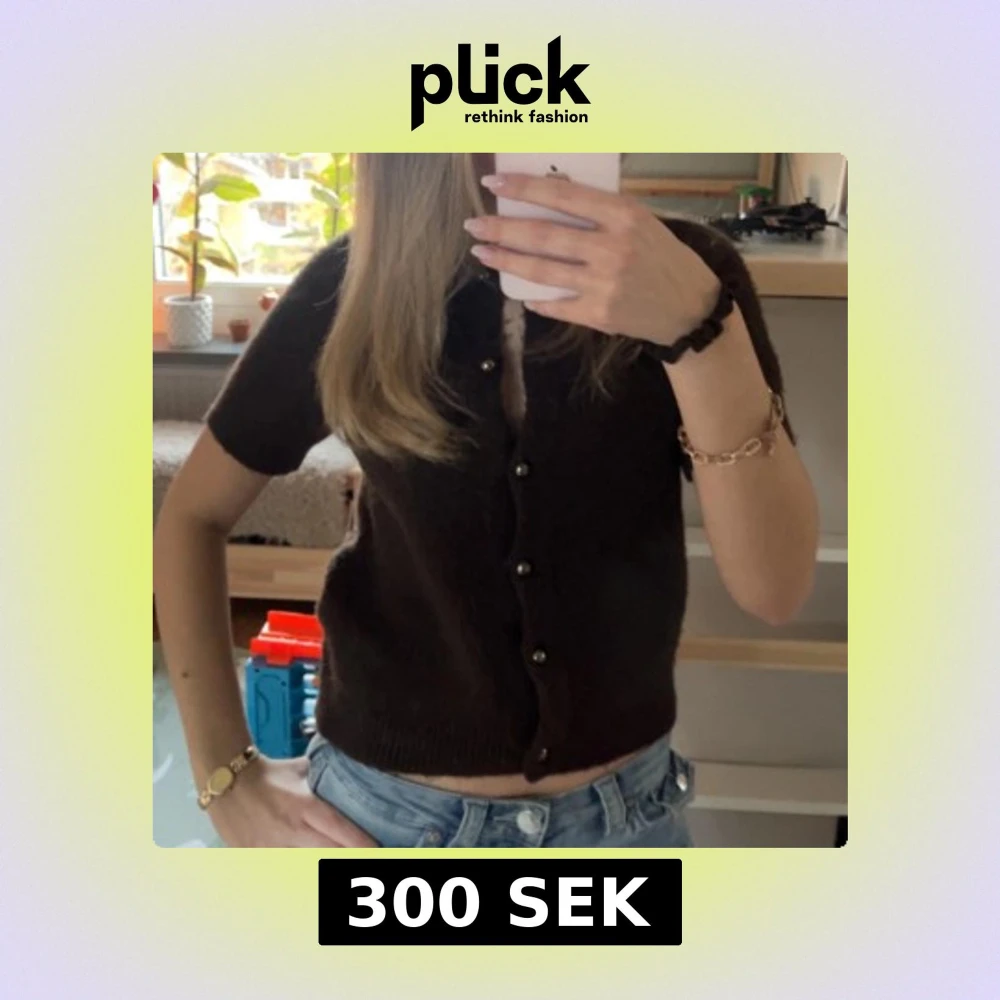 Säljer en brun stickad tröja med korta ärmar och knappar framtill. Modellen är croppad och har en klassisk rund halsringning. Perfekt att styla med jeans eller kjol. Ej stickig