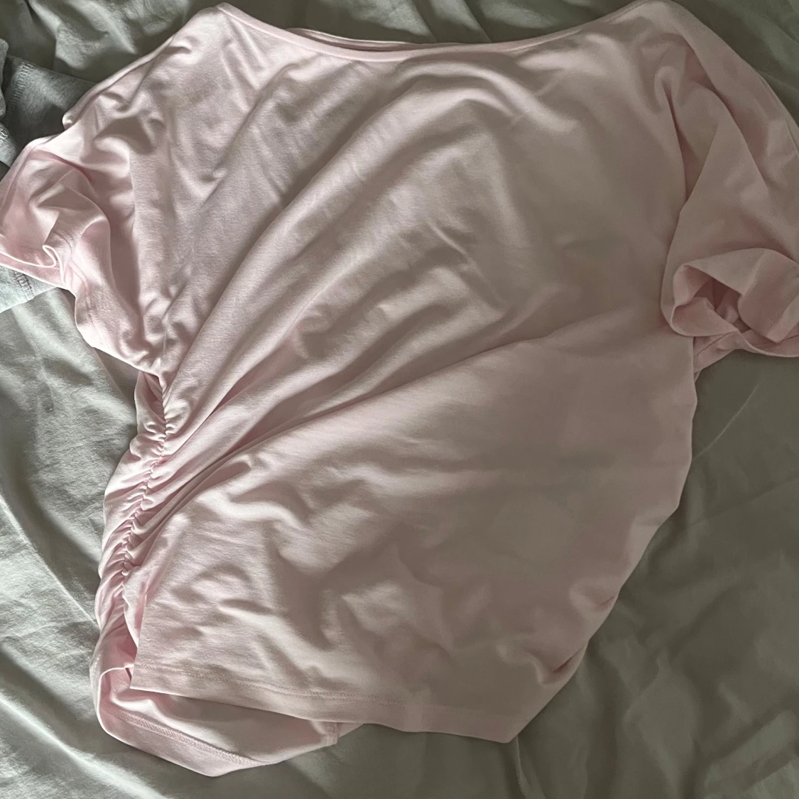 Supersöt ljusrosa topp från Gina Tricot med korta ärmar och lätt rynkade detaljer på sidan.
