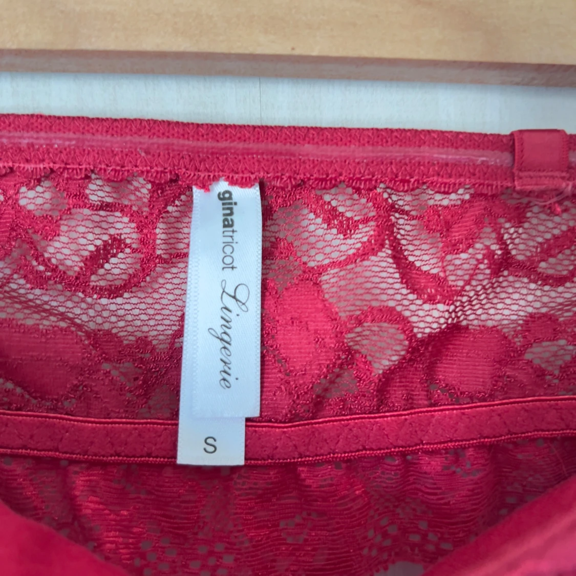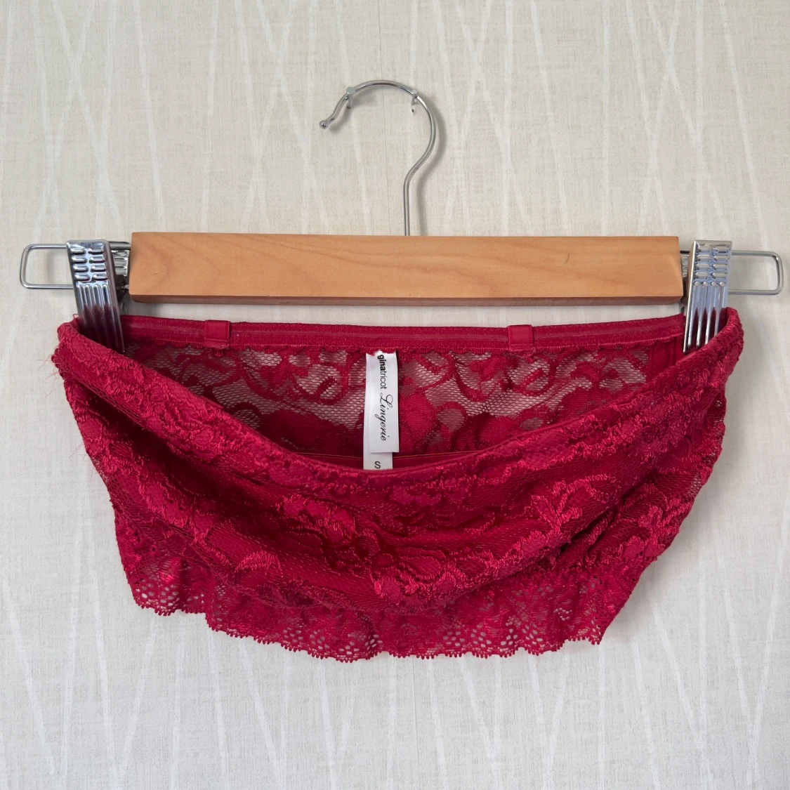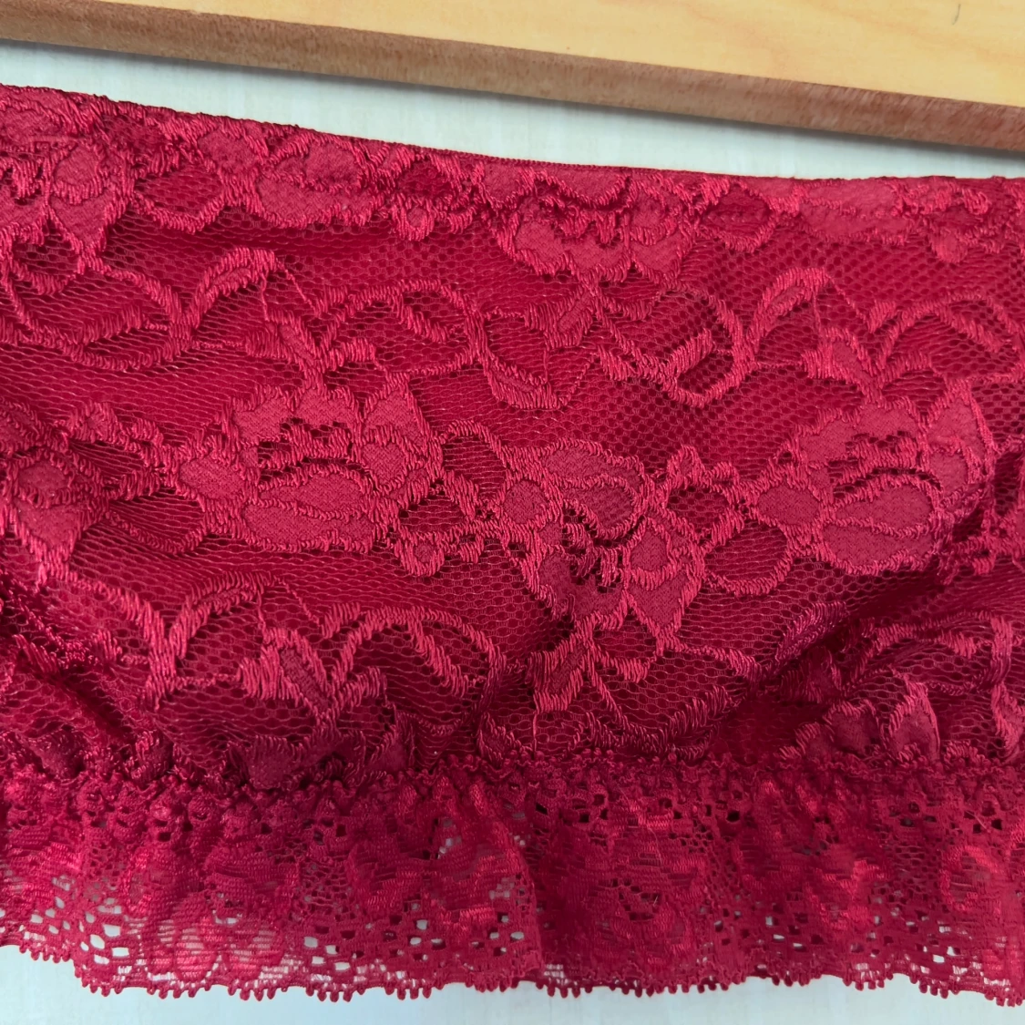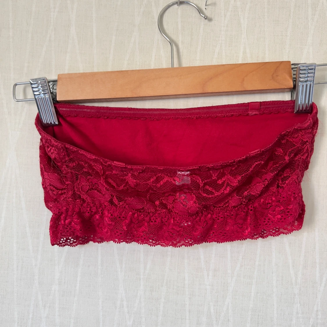 Säljer en vinröd bandeau tubtopp från Gina Tricot med vacker blommig spets och fodrad insida. Toppen är axelbandslös och har en romantisk känsla med sina fina spetsdetaljer. Perfekt att styla under en skjorta eller kavaj.