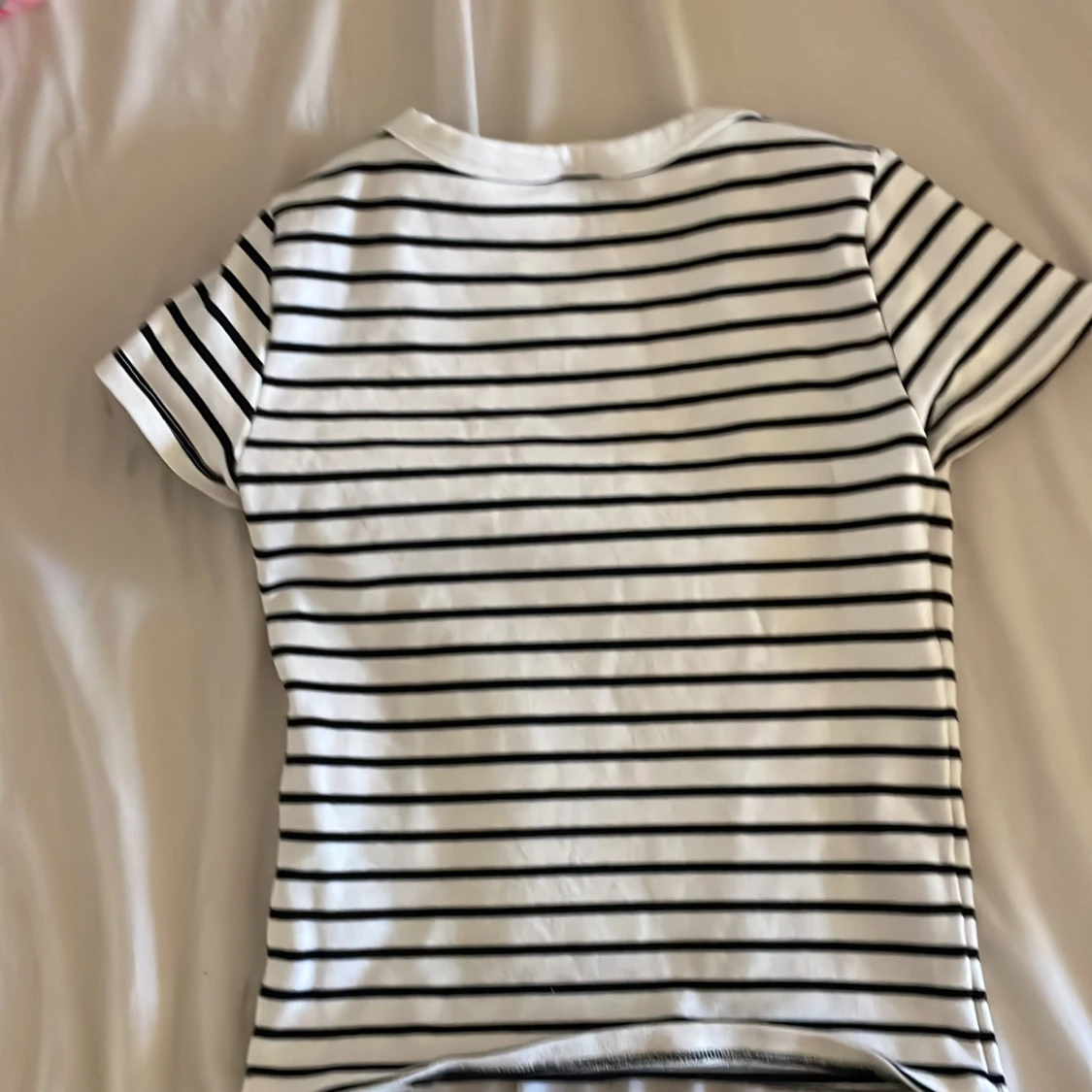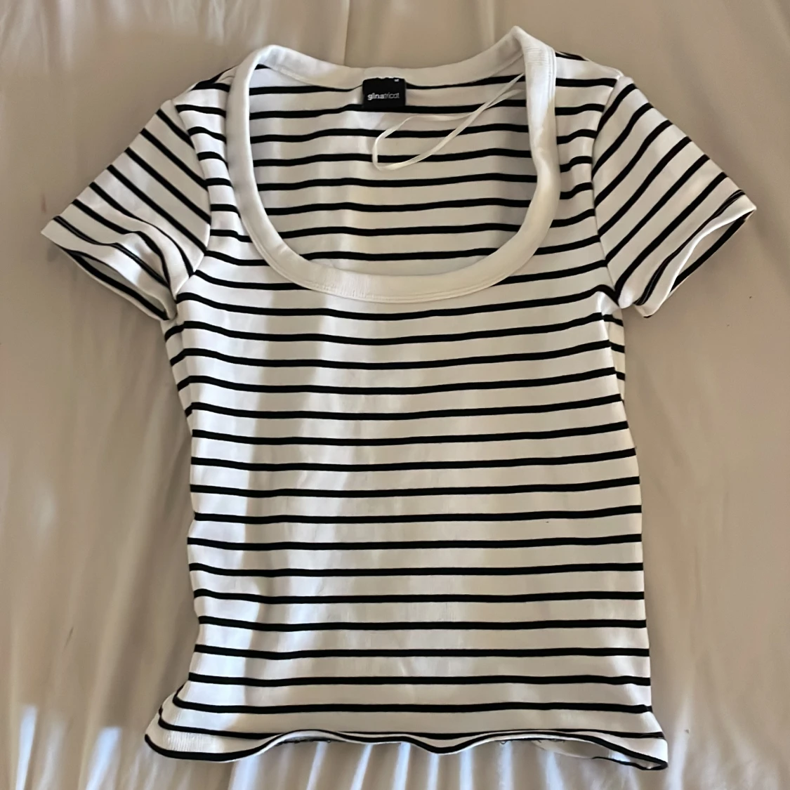 Säljer en vit och svart randig topp från Gina Tricot. Toppen har rundad halsringning, korta ärmar och är figurnära i passformen. Perfekt för dig som gillar enkel och stilren design med en fräsch vibe. Materialet är mjuk bomull som känns skönt mot huden. Storleken är liten så motsvarar xs-S