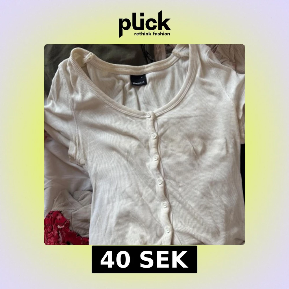 Säljer en vit ribbad topp med rund halsringning och knappar framtill. Toppen har korta ärmar och är i mjuk bomullskänsla, perfekt för vardagslooken.