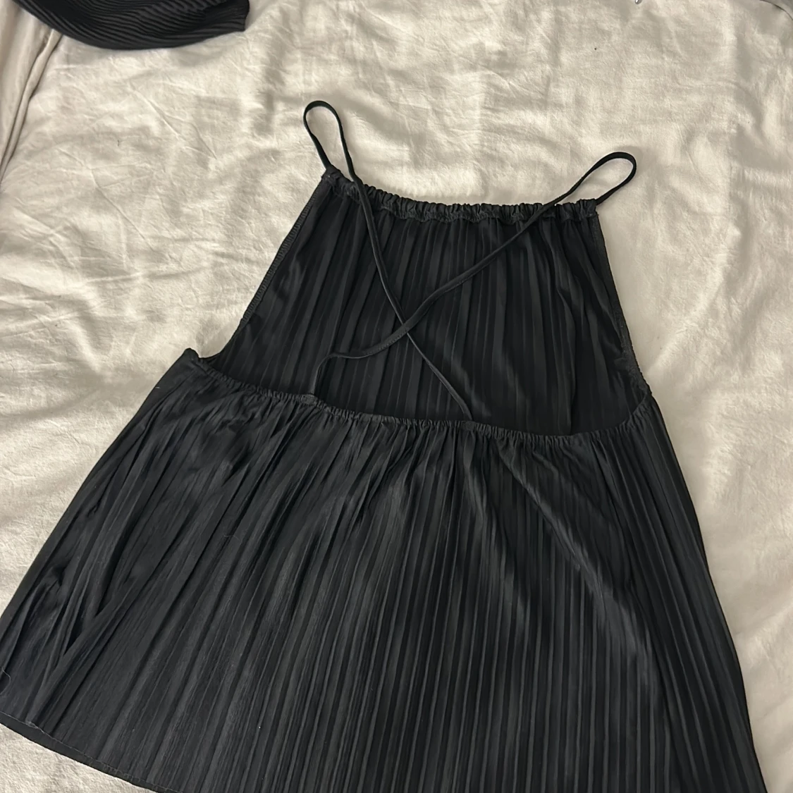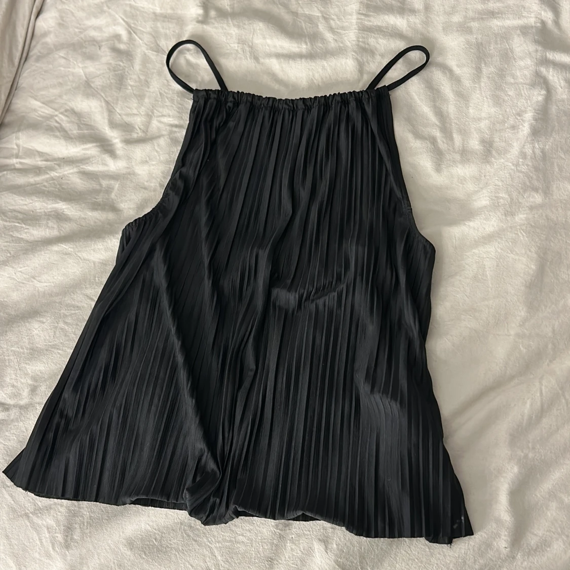 Elegant svart linne med tunna axelband, öppen rygg och plisserad design. Perfekt för en stilren look.