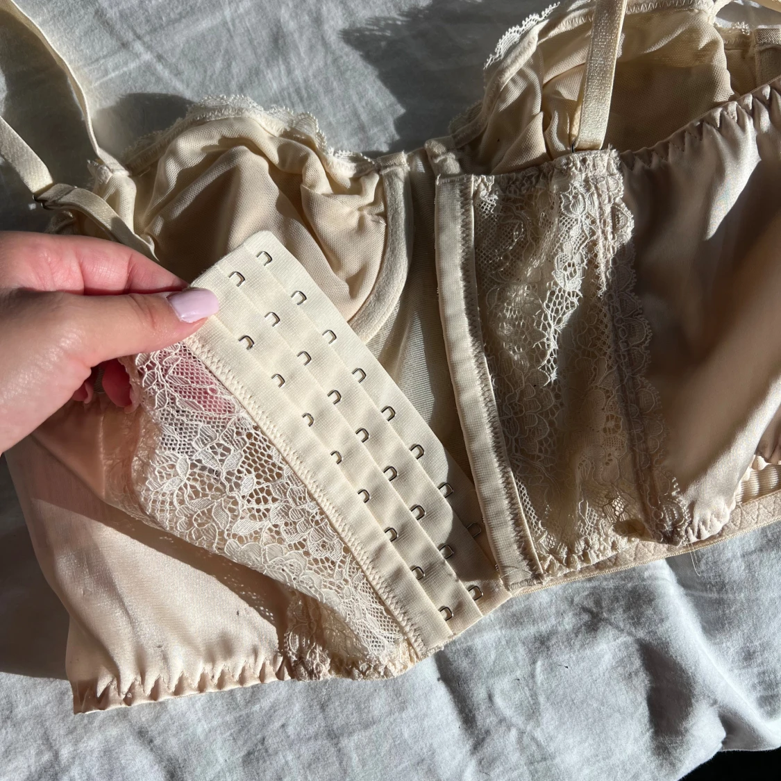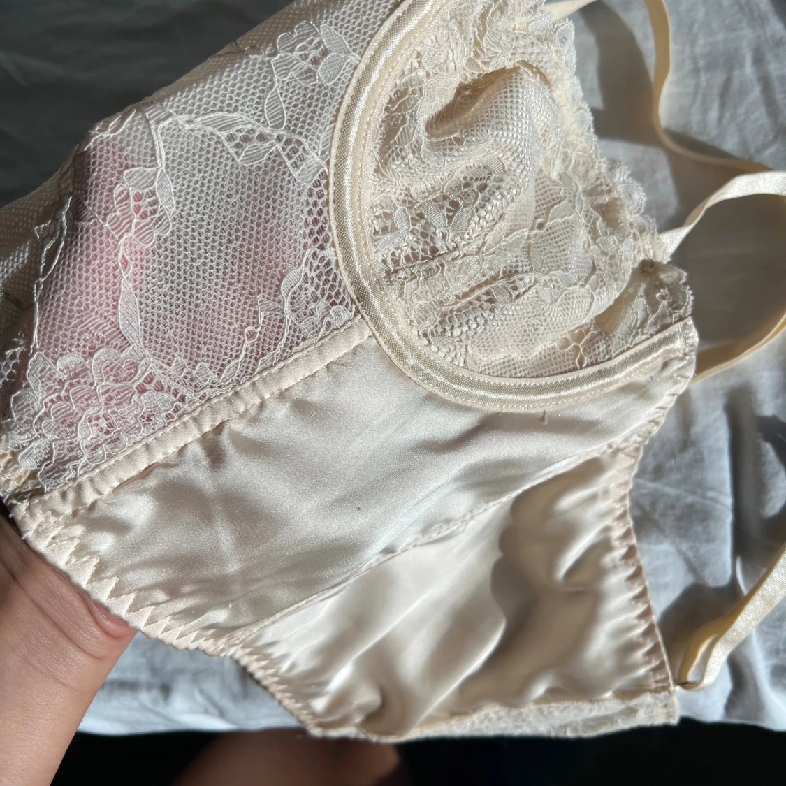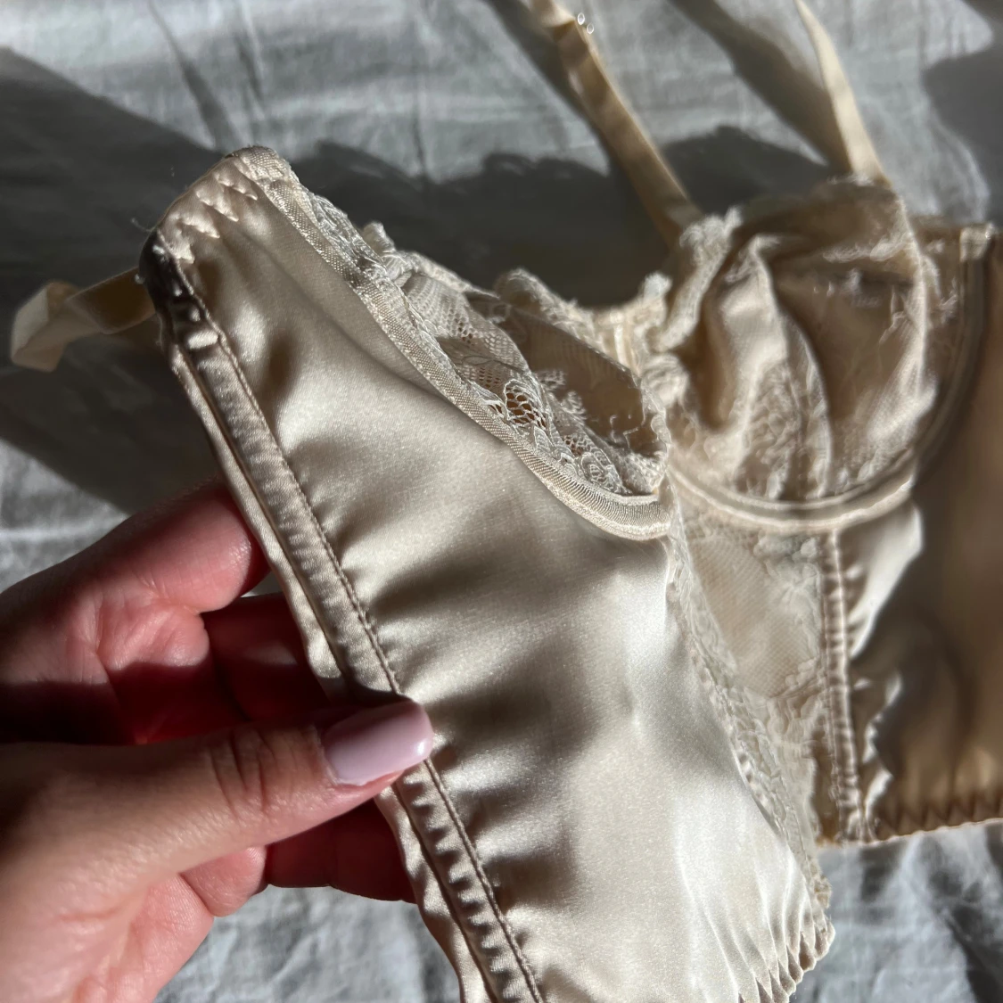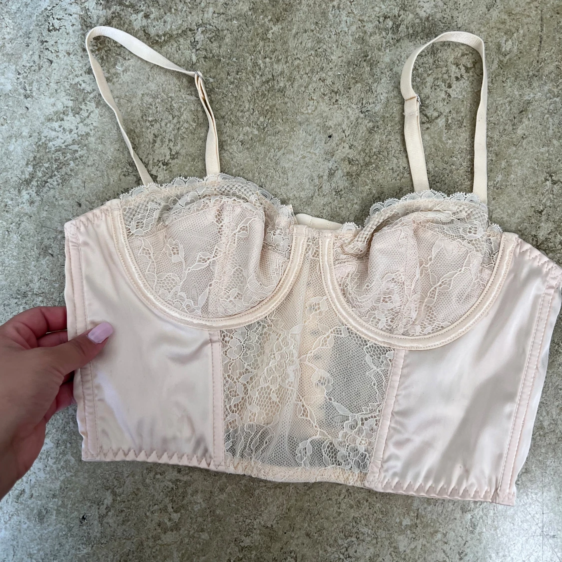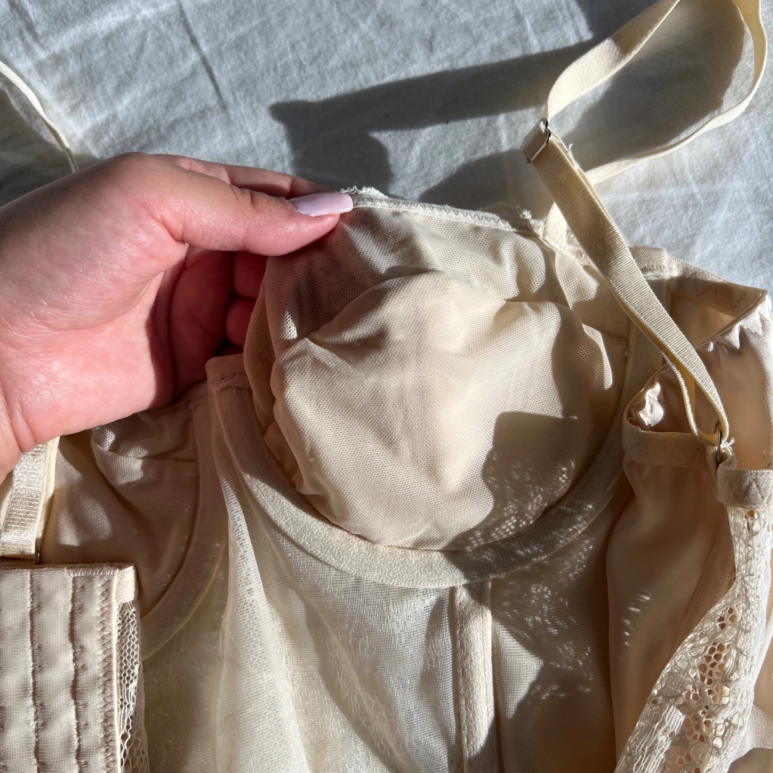 Säljer en champagnefärgad korsett med justerbara axelband och vackra spetsdetaljer framtill och på kuporna. Toppen har hakknäppning bak och är tillverkad i satin och spets för en lyxig känsla. Perfekt för dig som vill ha en feminin och trendig look.