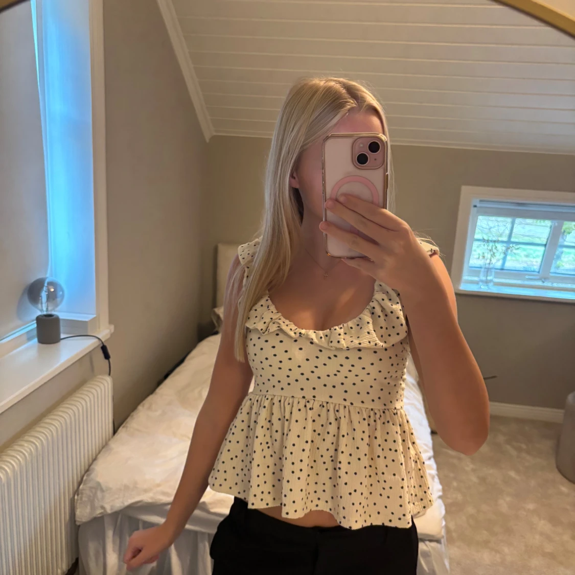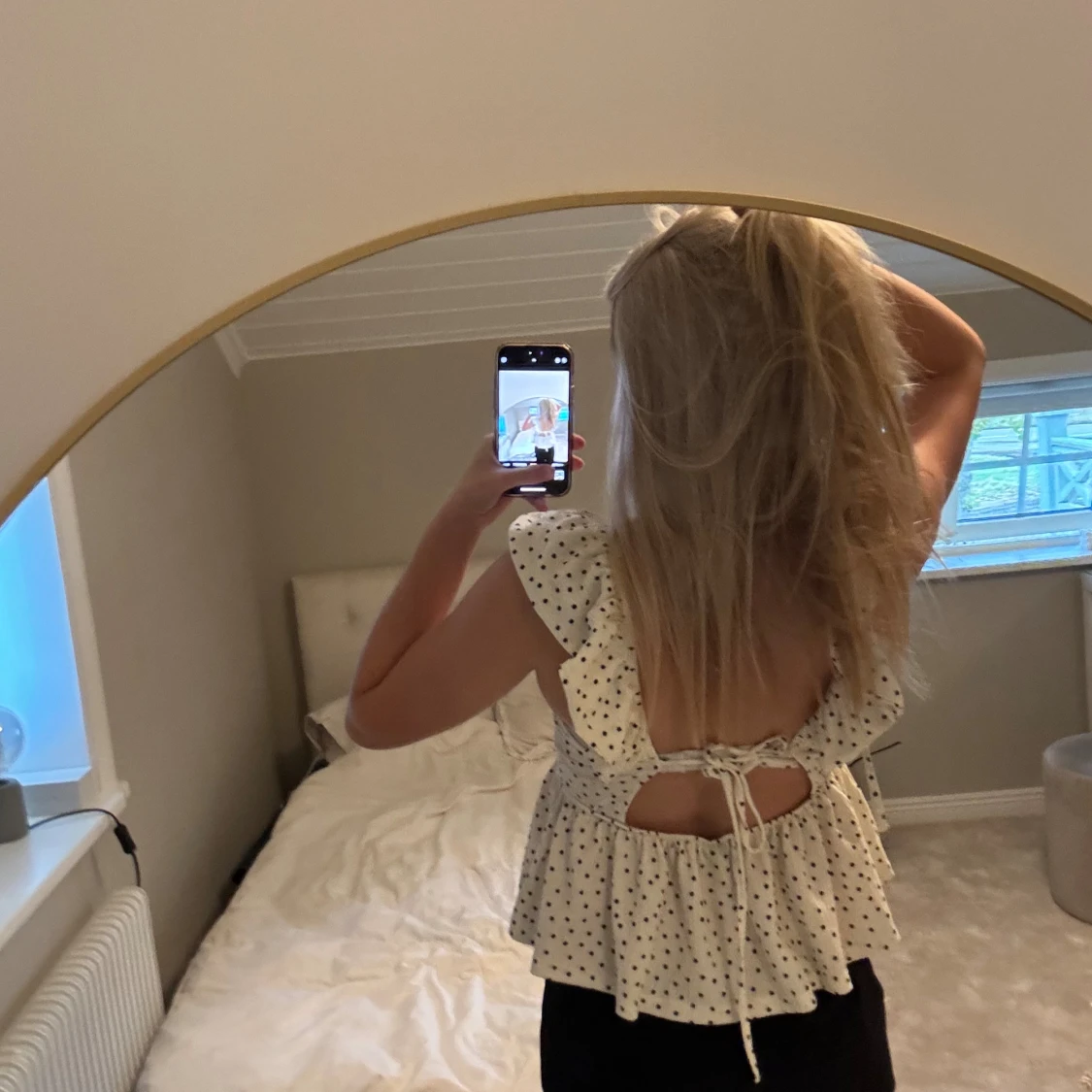 Säljer en supersöt och prickig blus🤍endast använd en gång🤍man knyter den i ryggen🤍storlek S men skulle säga att den även passar XS