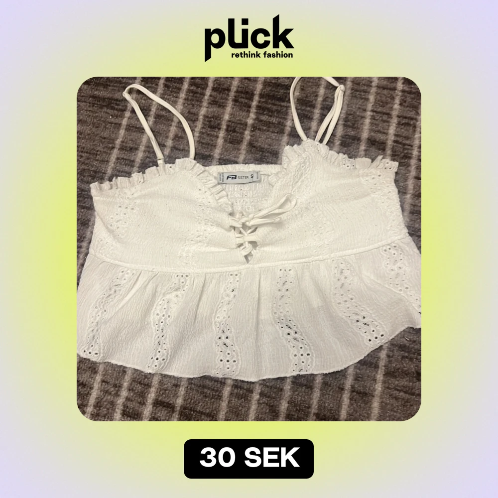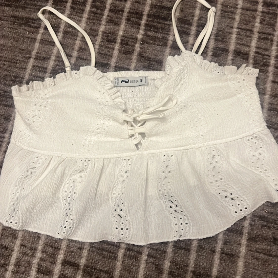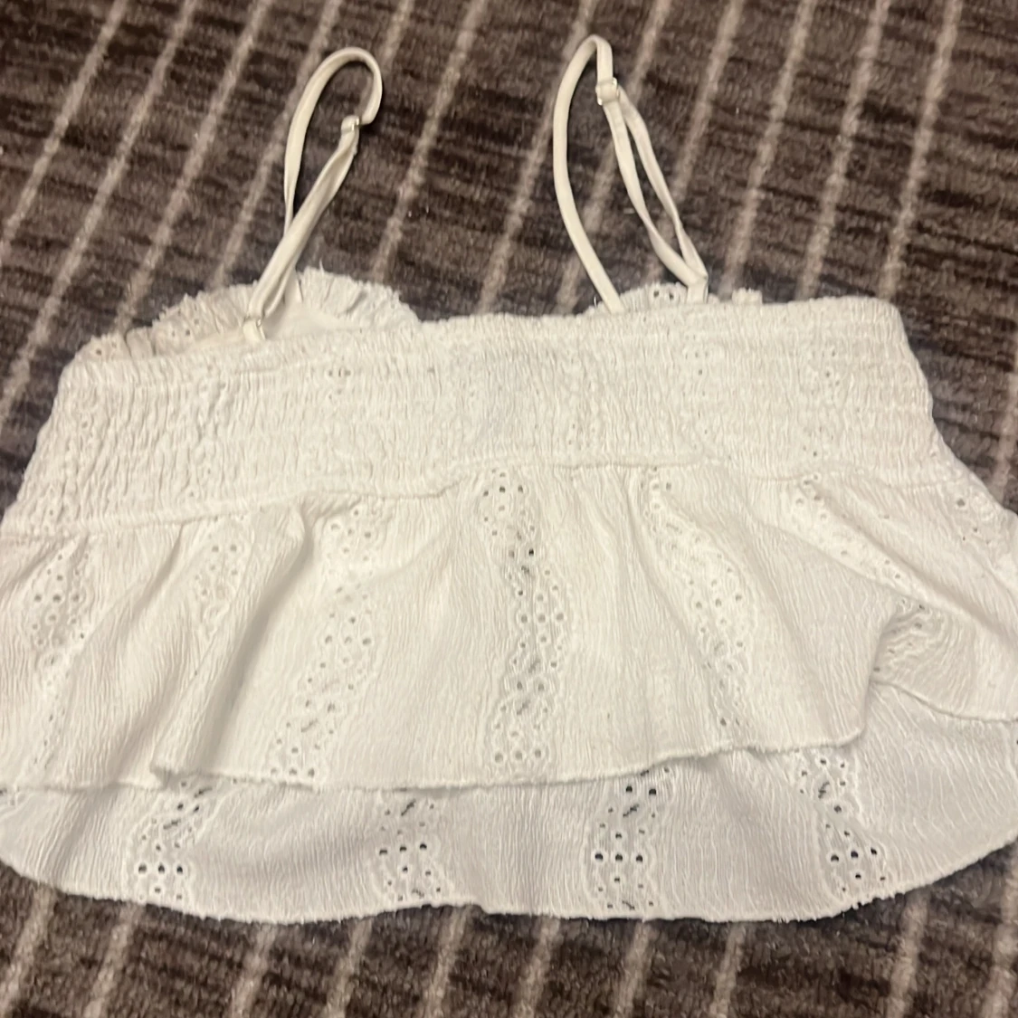 Säljer en superfin vit topp från New Yorker i storlek S, fast den passar xs också. Den har smala axelband och vacker spetsdetaljering. Toppen är croppad och har en söt knytning framtill.