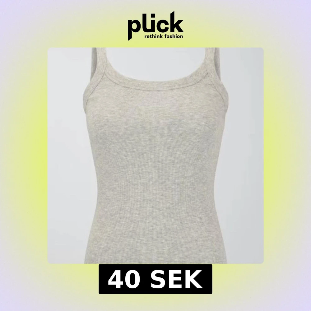Säljer en grå linnetopp från Gina med breda axelband och rund halsringning. OBS: tröjans nedre söm är sönder lite där bak men det är inget som syns.