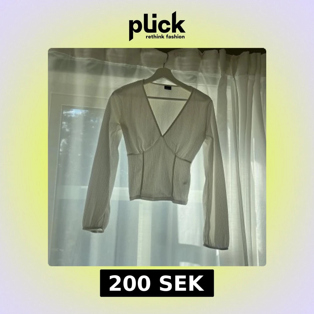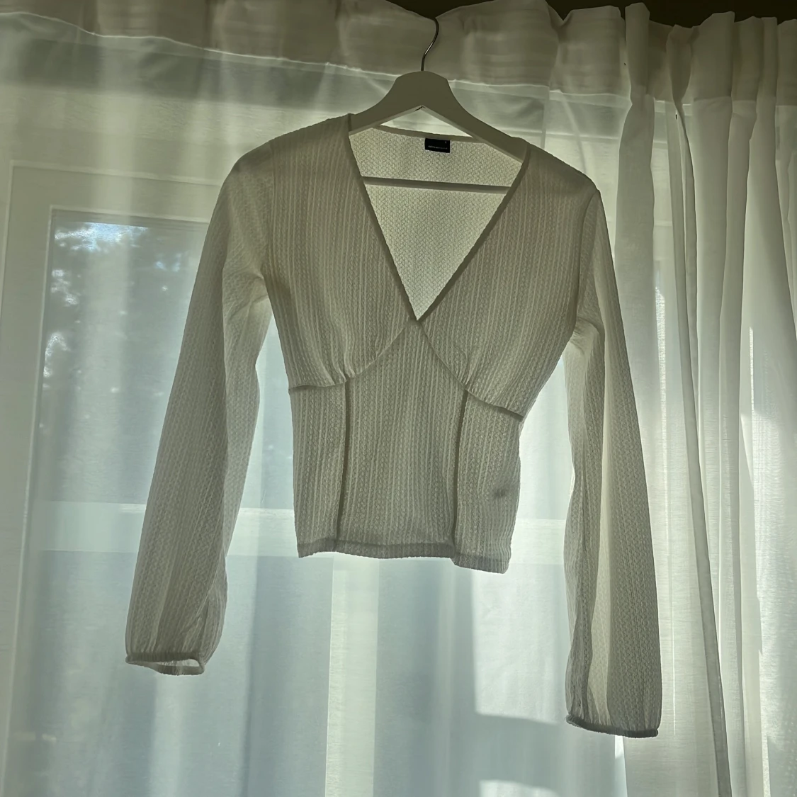 Säljer en vit omlottopp med djup v-ringning och lång ärm. Toppen har en lätt ribbad struktur och sitter figurnära över kroppen.