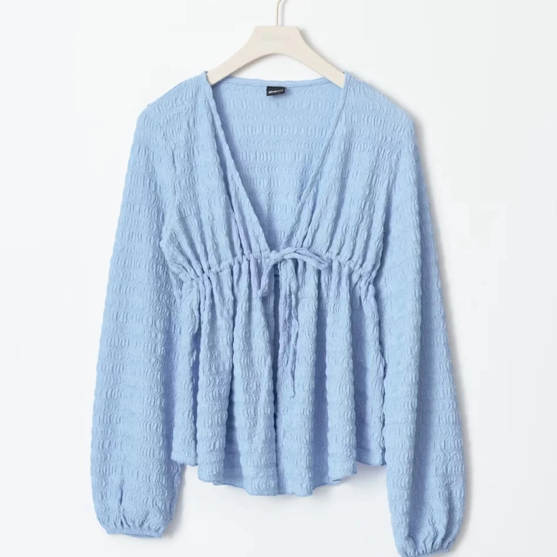 Supersöt ljusblå blus från gina med omlottknytning i midjan och v-ringning. Blusen har lång ärm och är gjord i ett vågigt, strukturerat tyg som ger en unik look. Perfekt för dig som gillar en luftig och trendig stil.
